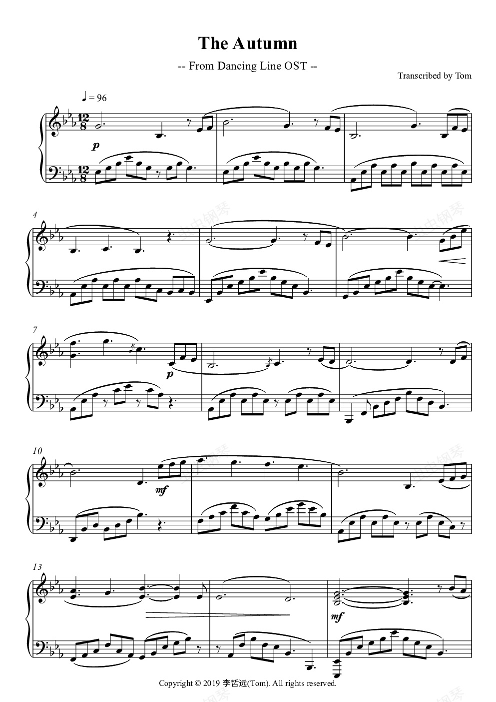 作品说明:本钢琴谱是根据游戏 跳舞的线【秋天】关卡 改编的试听1是原谱MIDI,试听2是原版MP3喜欢的朋友可以加下如有改进的地方欢迎在下方评论或者注:版权所有,翻版必究。
