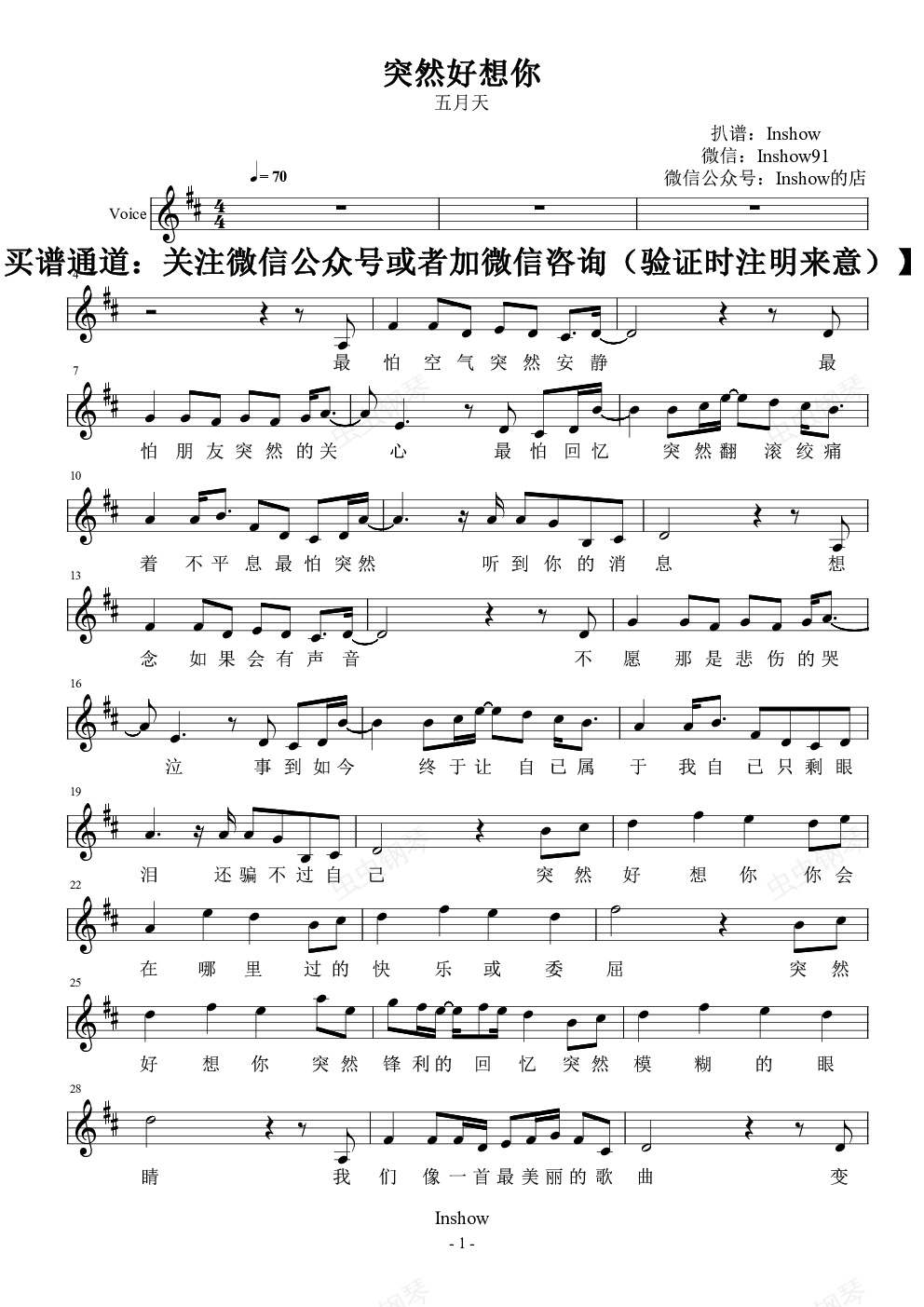 钢琴谱:五月天 - 突然好想你【钢琴伴奏谱】