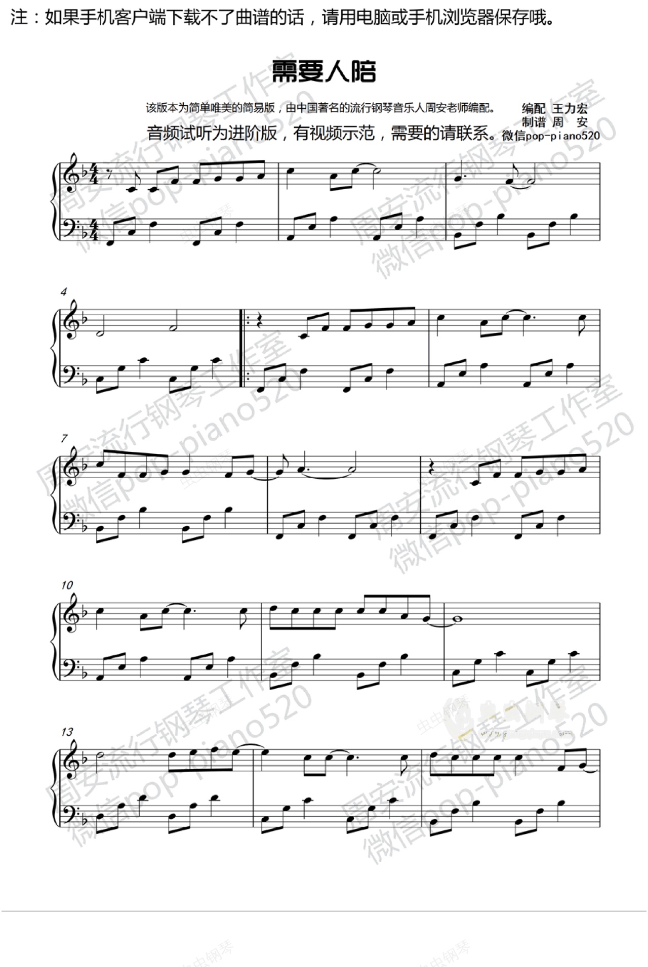 钢琴谱:《需要人陪》唯美钢琴版(周安老师)