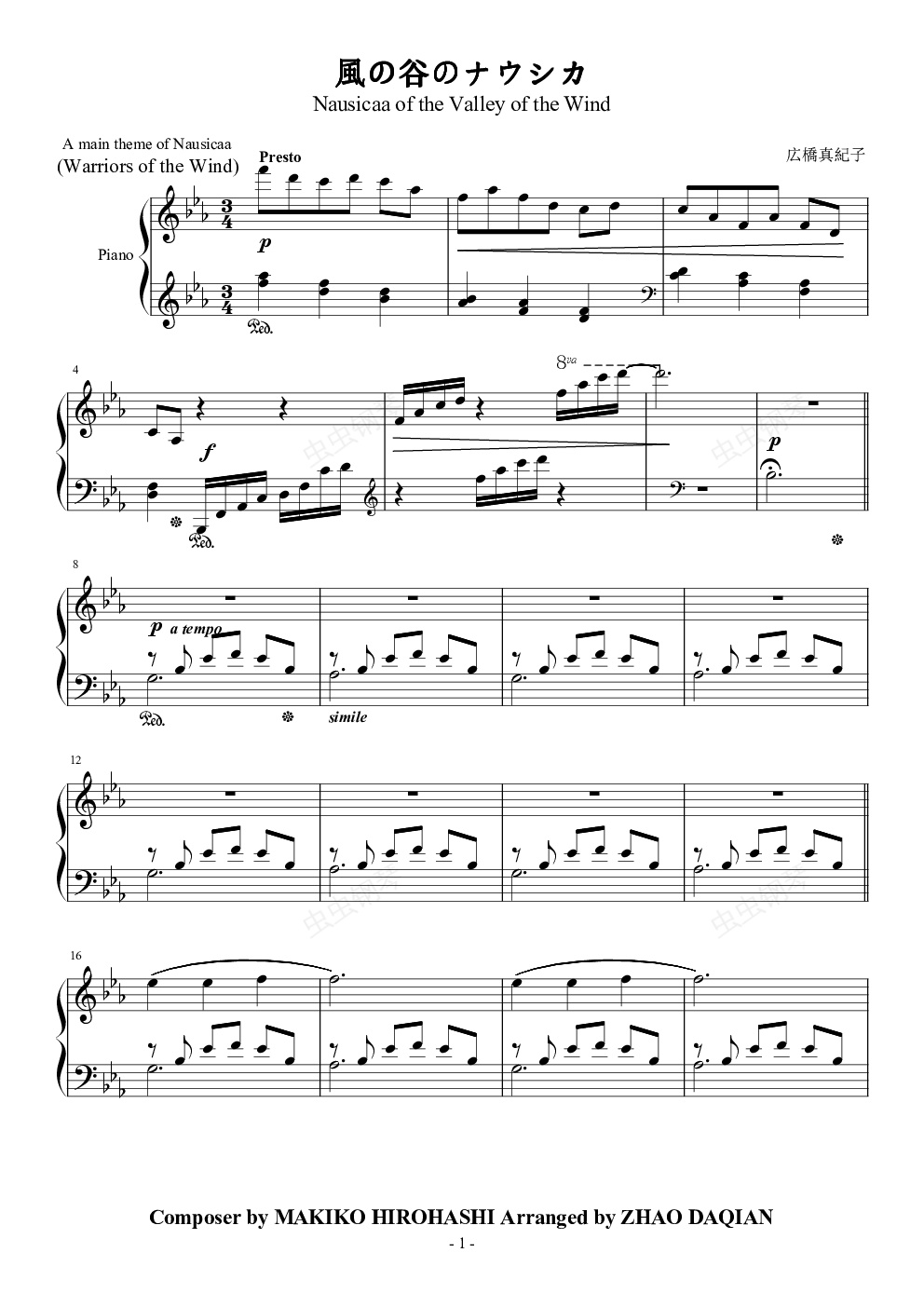 这是一首来自日本动画电影《风之谷》中的同名主题曲。日文名字的读音是,即:风之谷的娜乌西卡。我们根据广桥真纪子的版本改编成钢琴曲。影片《风之谷》(英语 of the of the Wind)改编于宫崎骏的同名漫画,宫崎骏担任影片的导演,岛本须美、纳谷悟朗和松田洋治联袂献声。影片于1984年3月11日在日本上映。影片讲述千年前世界的产业文明达致巅峰后,经历一场称为“火之七日”的战争而毁于一旦。世界被一种由菌类构成,名叫腐海的新生态体系所掩盖,只有巨型昆虫能够适应其中,而人类们生活在仅存的小面积土地上,在面对巨型昆虫和会释放瘴气的腐海森林包围威胁下积极求存的故事。据了解,该影片的出品发行公司为日本大名鼎鼎的吉卜力工作室,具体的拍摄日期为1983年5月31日至1984年3月6日,1984年3月11日在日本正式上映。1000年后的人们,并不是生活在天堂里,而看上去美丽的景象,其实是危机四伏。在人类自我毁灭的浩劫后,以菌类为主的腐海森林,散发着有毒的气体,逐渐的侵蚀着人类的居住区,而生活在腐海中的王虫群,更是可以在瞬间毁灭辛苦建立起来的新的家园的恐怖生物。遭人类破坏后的世界的一些边缘国家的人类生活,风之谷是其中一个, 也是一个世外桃源。一个重要的原因是山谷面对大海, 海风的吹向导致能感染的孢子不会吹进山谷,另一个原因, 是山谷的公主娜乌西卡,她的智慧和爱心化解了谷民和王虫之间的多次矛盾。故事从巨型输送机坠落在风之谷开始。这架输送机是多鲁美奇亚原本用来载送工业都市“培吉特”国俘虏。娜乌西卡将夹在残骸中的少女拉丝黛儿救出,而少女却要求娜乌西卡将残骸烧毁。虽然不明其意但为了让少女安心而答应了,少女随即死去。隔天在坠落地点发现了跳动着的巨大血管群。那就是在“七日之火”将世界付之一炬的最终兵器“巨神兵”。获知了坠落的多鲁美奇亚王国的皇女库夏娜,派出了大批编队至风之谷。士兵们陆续闯入城中,震天的枪声惊慌的娜乌西卡奔至父亲房间,发现其父基尔已气绝。为了谷中人民,娜乌西卡自愿做人质和库夏娜等到培吉特。娜乌西卡等人乘坐的大型输送艇,载着其他人质及粮食向着培吉特出发。途中向其袭击而来的是驾驶着战斗艇的培吉特少年阿斯贝鲁。被侵袭的多美吉亚王国的船迅速地坠落。娜乌西卡所乘的输送艇也早已起火,眼下浓密弥漫,娜乌西卡的战斗艇慢慢地降落,最后降在被巨木包围着的水面。水中王虫将阿斯贝鲁迷失在活腐海的消息告知娜乌西卡,于是娜乌西卡告别吓呆了的库夏娜和城中老伯们,准备去救出阿斯贝鲁。被大群王虫穷追不舍的阿斯贝鲁掉进巨水下的空洞里。在阿斯贝鲁将被虫吞唑之时,乘着滑翔翼的娜乌西卡如风般的出现。娜乌西卡救阿斯贝鲁时,不小心掉落地面,砂覆盖娜乌西卡的身体,随即陷落进去。终于连滑翔翼也一起被砂所吞噬,然而到后来却有了意外的发现。离开腐海后,娜乌西卡获悉培吉特以一只小王虫为做诱导大群王虫到风之谷,于是娜乌西卡徒手与飞行机的乘组员对峙。他把枪指着娜乌西卡,开始展开攻击。娜乌西卡张开双臂,朝向运行机运去。受了冲击的飞行机掉坠落在酸湖旁。被抛至地面上的娜乌西卡忍着身上的疼痛向着满身疮痍的小王虫慢慢接近。然后,挺身阻止欲进入酸湖的小王虫。小王虫似乎明白了娜乌西卡的心意,小王虫的眼睛由红色转为蓝色。而娜乌西卡以自己性命阻止疯狂前进的王虫大群。在王虫得知娜乌西卡牺牲自己阻止它们的袭击后,用口中的金色触须医治娜乌西卡的伤而令她再次复活。