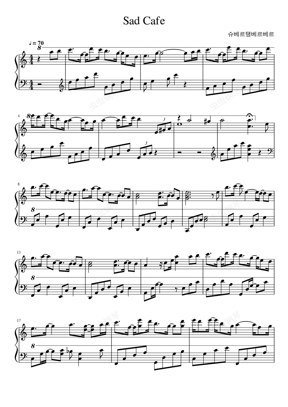Sad Cafe,我最最最喜欢的纯音乐之一!!根据网上找到的五线谱的片段扒完了整首曲子。尾声部分的节奏可能有一点不准确。我就算抛砖引玉了,希望有大佬来完善一下。 = = 我还不太会调音,所以MIDI版的音乐音很重,见谅啦