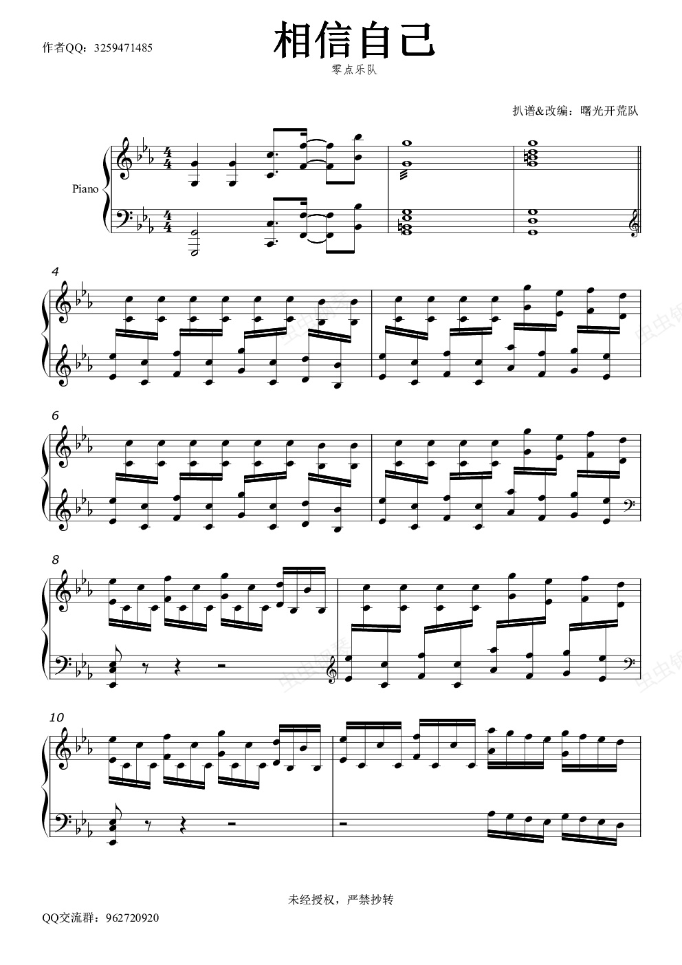 钢琴谱:相信自己-零点乐队 曙光开荒队改编