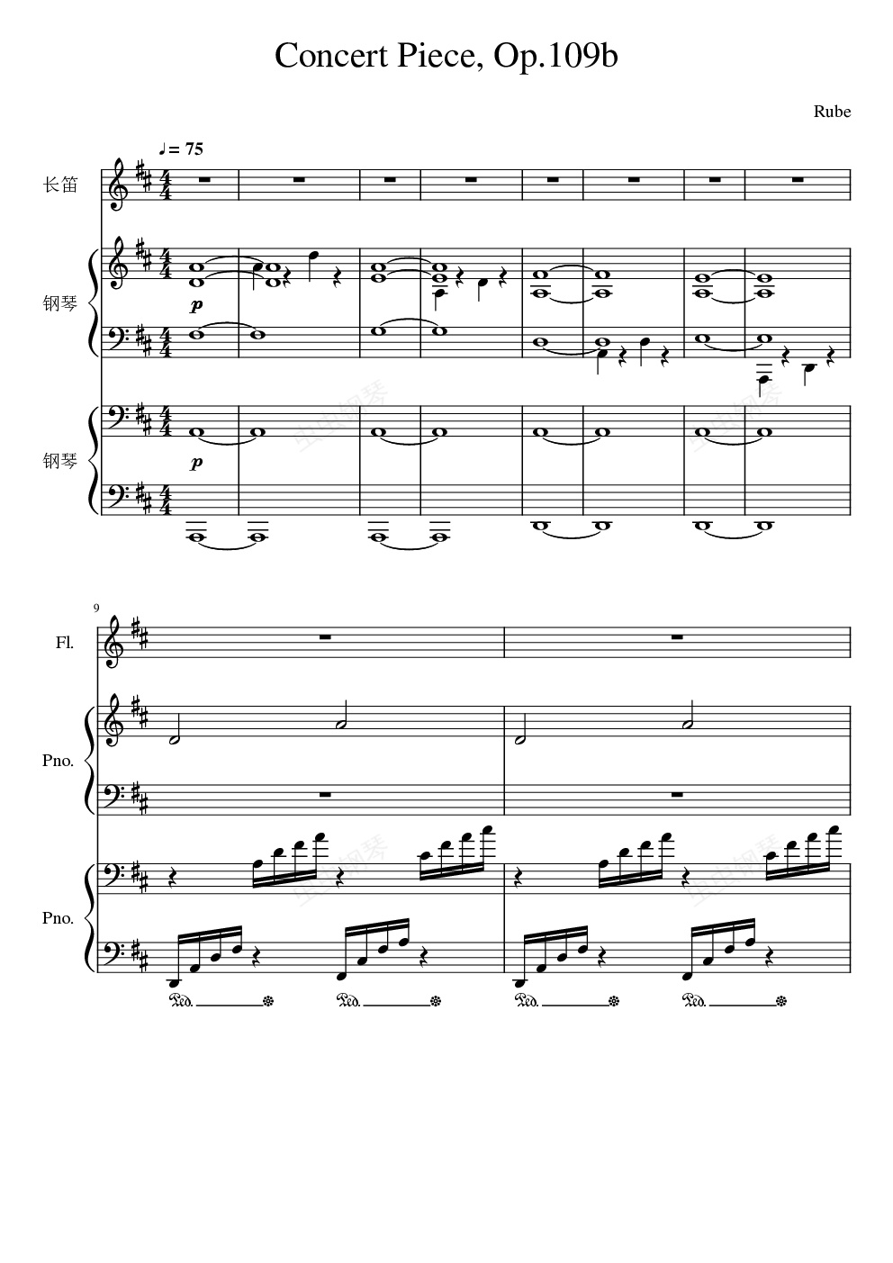 钢琴谱:Clair de lune, Op.109b (Version for two pianos and flute in D Major)