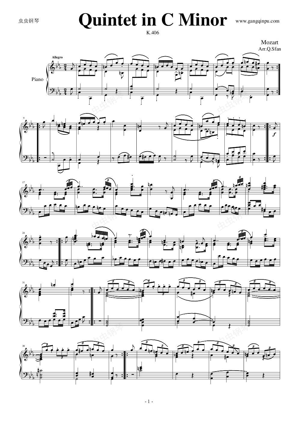 钢琴谱:弦乐四重奏K406终乐章