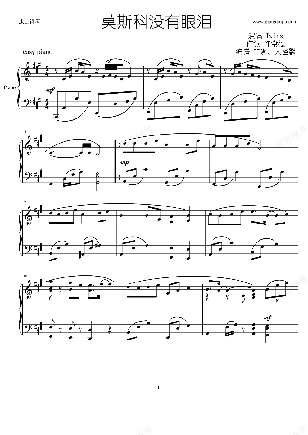 钢琴谱:莫斯科没有眼泪