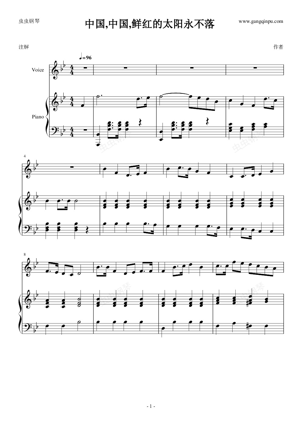 钢琴谱:中国,中国,鲜红的太阳永不落