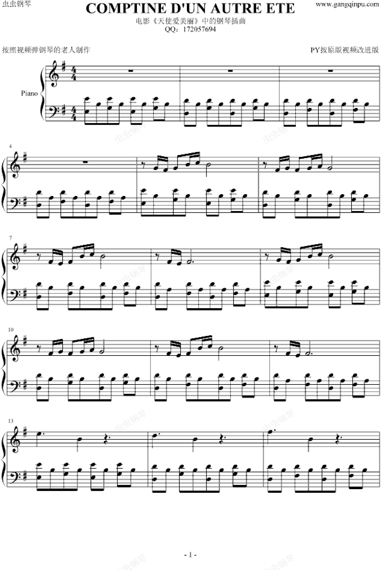 钢琴谱:《天使爱美丽》——PY按视频修改版