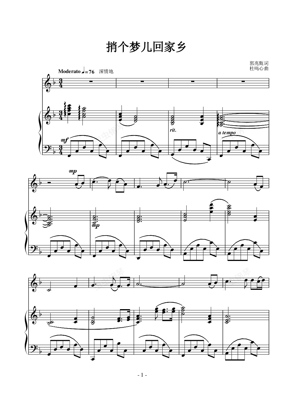 钢琴谱:捎個夢兒回家鄉(伴奏)