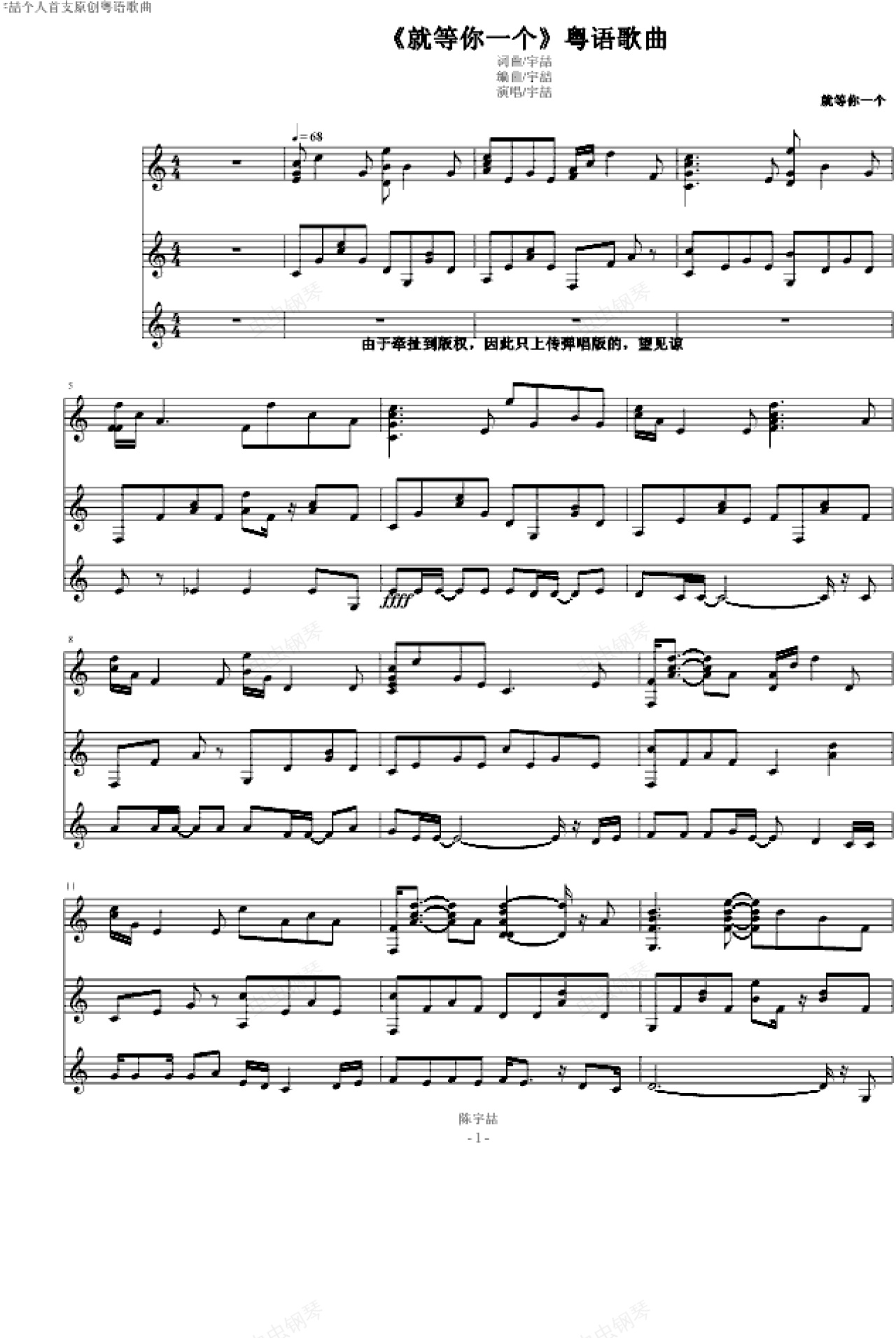 钢琴谱:就等你一个《个人粤语歌曲》