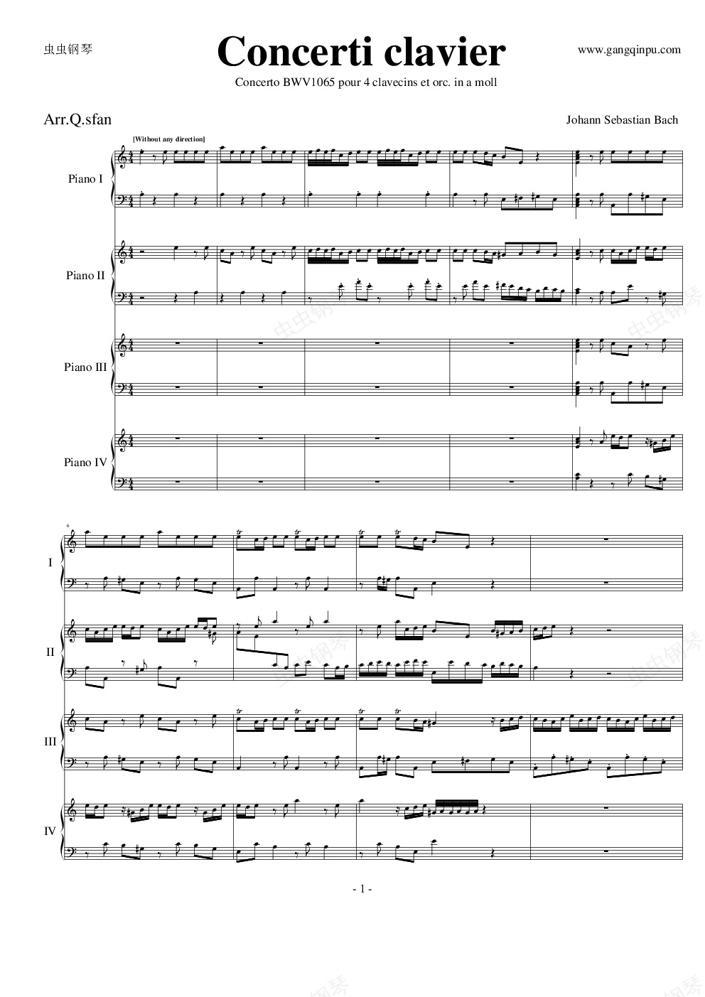 钢琴谱:巴赫为四架钢琴写的钢琴协奏曲