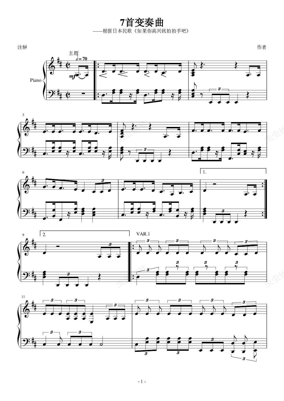 钢琴谱:根据《如果你高兴就拍拍手吧》创作的7首变奏曲
