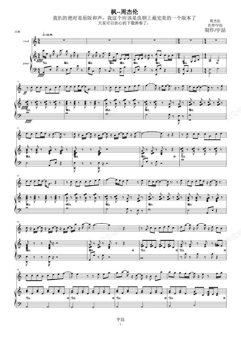 我扒的这个绝对是原版和声,由于谱面问题,我只上传了钢琴伴奏谱,用我的这个版本演奏绝对不会让各位吃亏的,毕竟是原版和声嘛,同时大家也可以听我扒的总谱版,虽然制作效果不是很好,但同样好听,呵呵,我看虫钢好多朋友的原创总谱,都有同样的一个缺点,就是BASS写的过低,这样一来低音听上去就很糊,呵呵,希望大家改正下哈。。