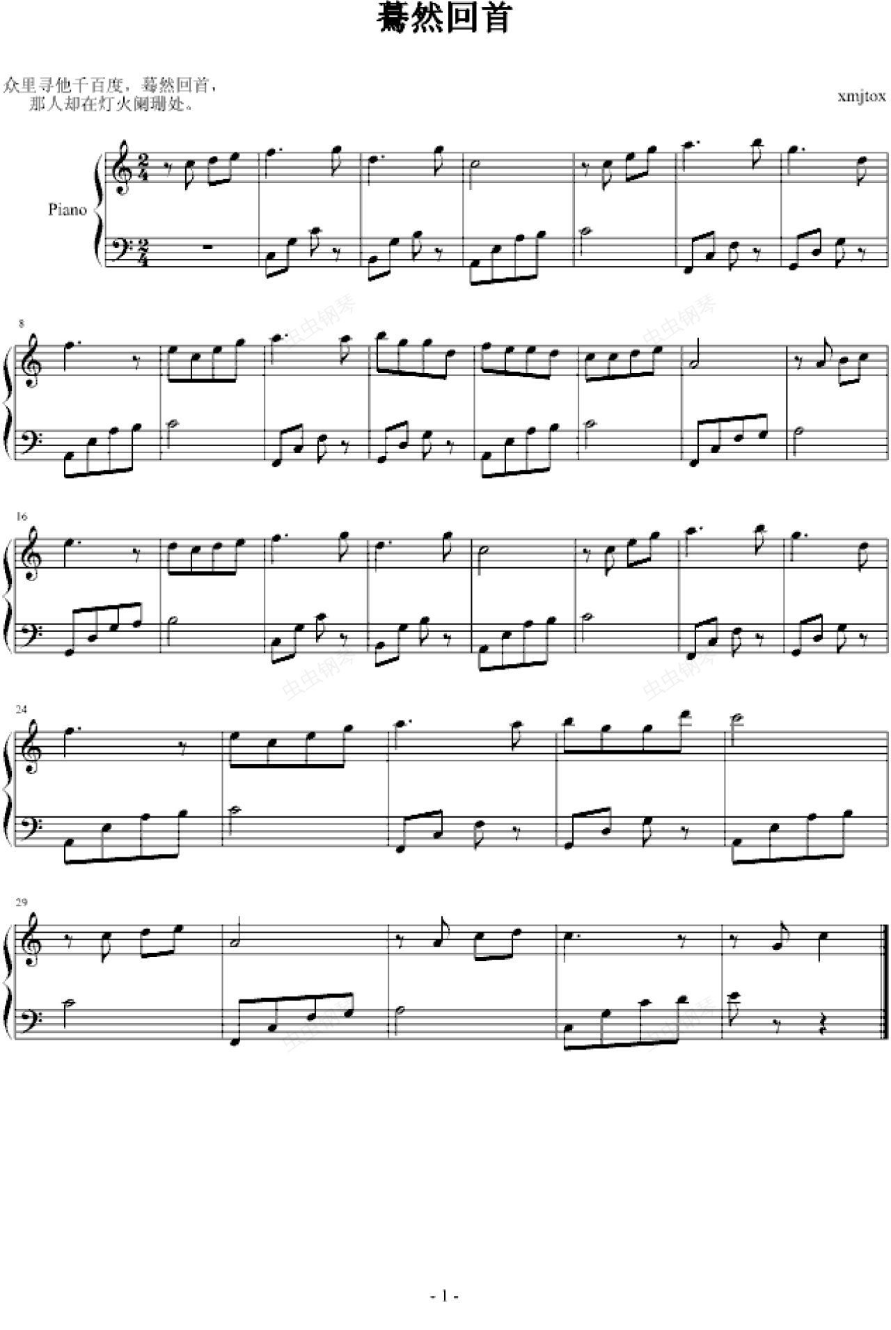 钢琴谱:驀然回首