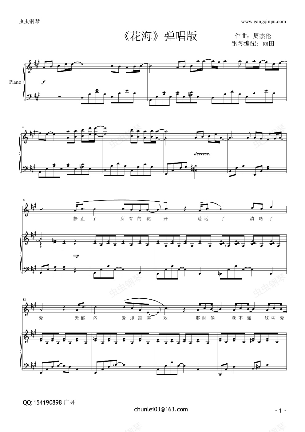 钢琴谱:《花海》弹唱版(雨田)