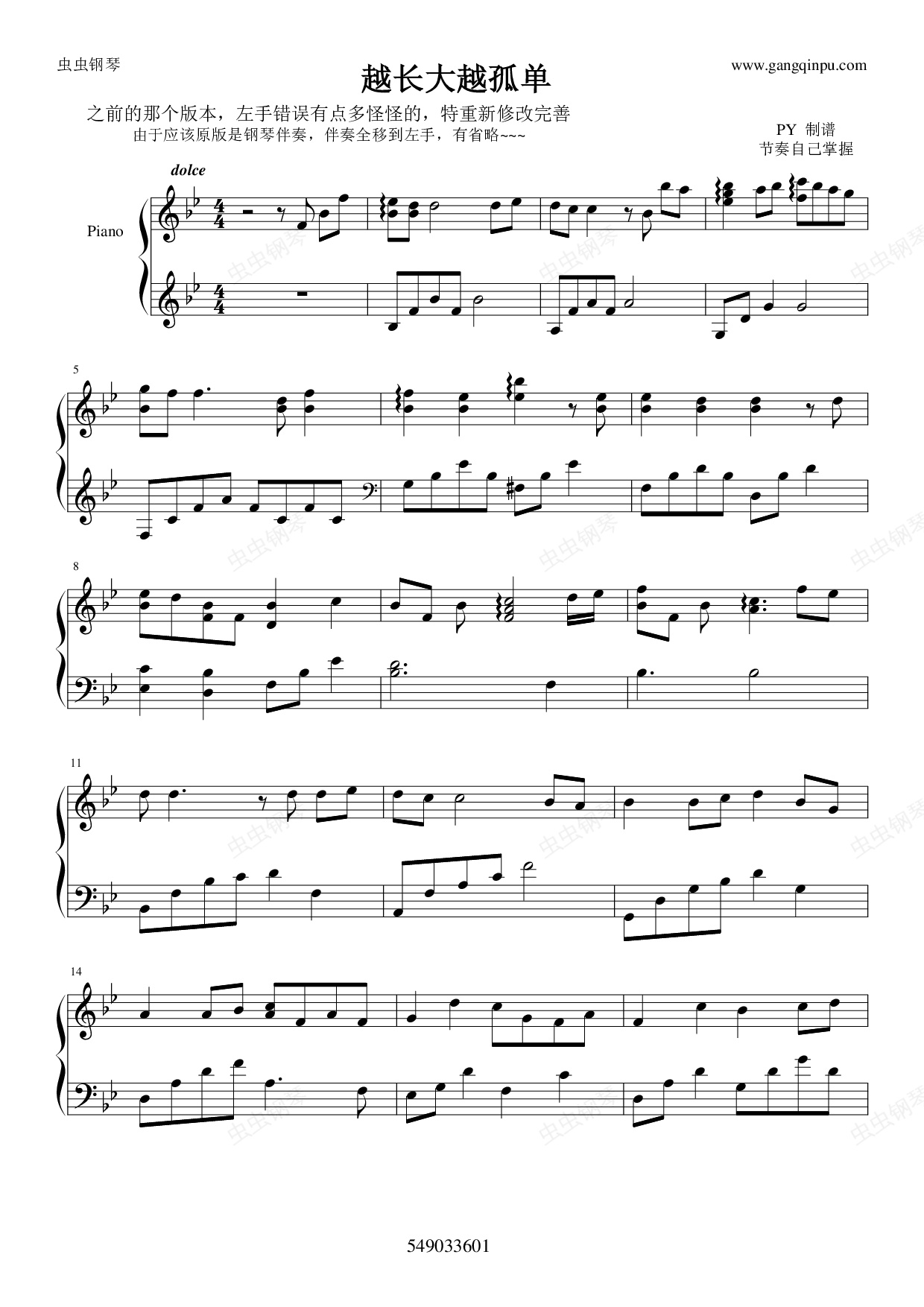 钢琴谱:越长大越孤单