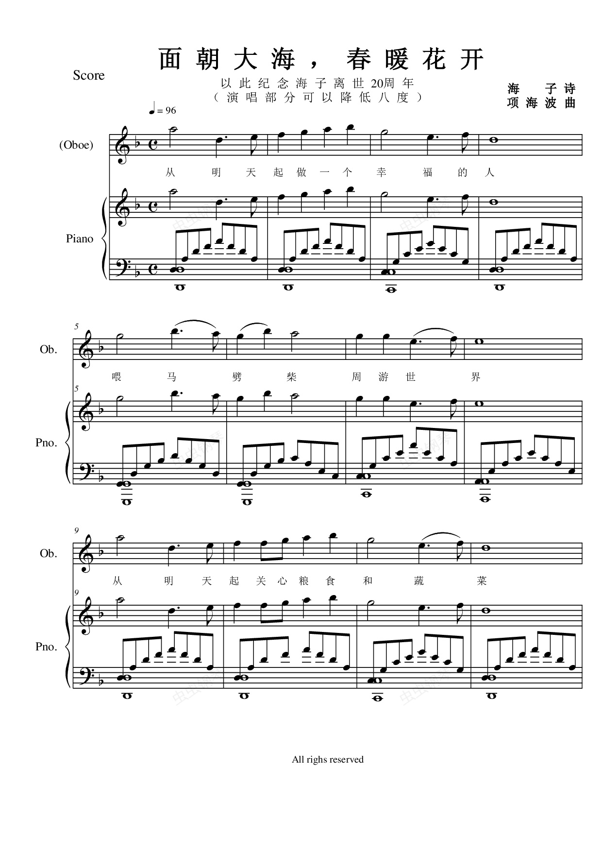 钢琴谱:面朝大海,春暖花开(唱词+钢琴)