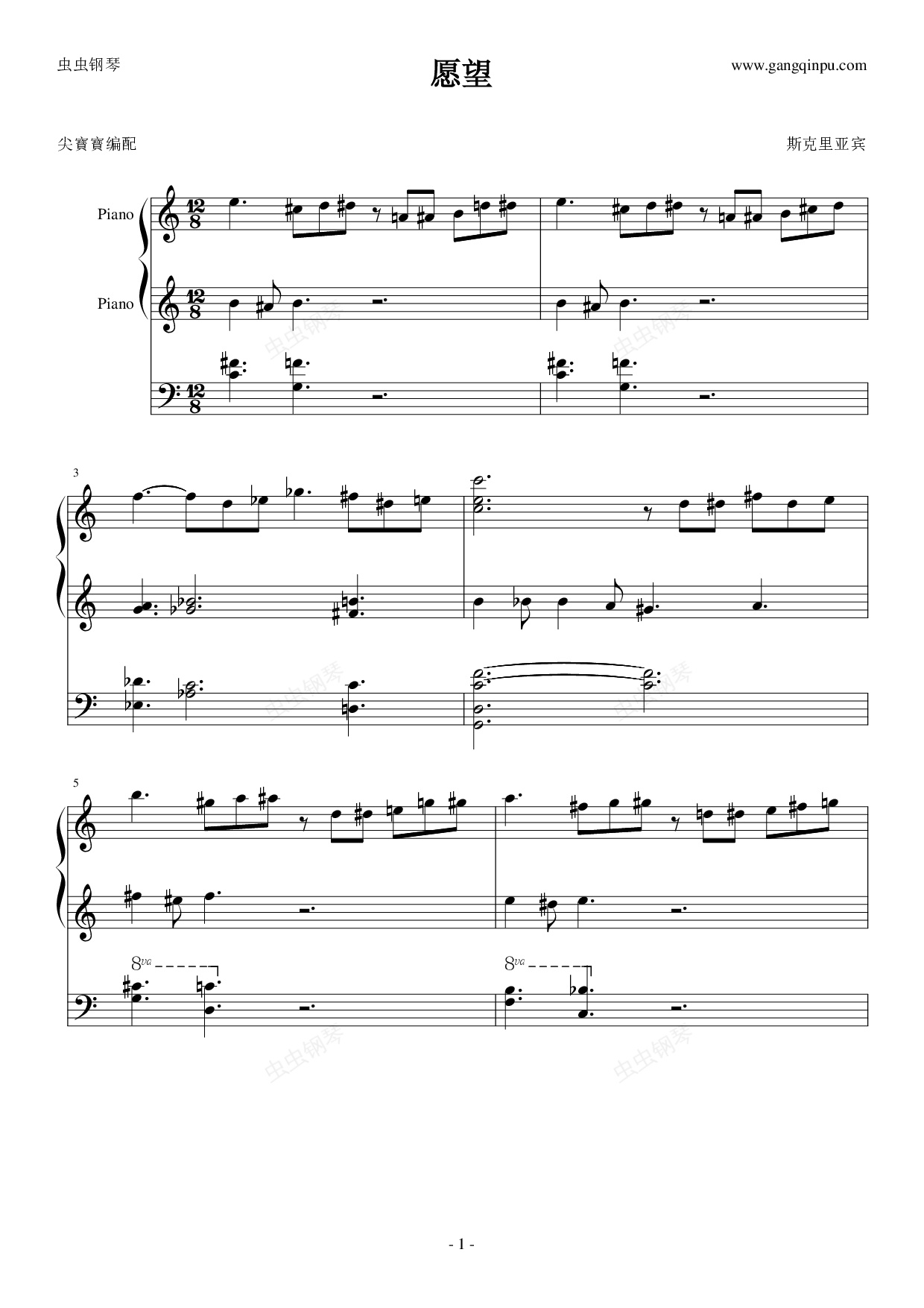 《愿望》是一首怪异的曲子。需要三架钢琴弹,因为音的跨度太大,一行谱需要两只手弹。