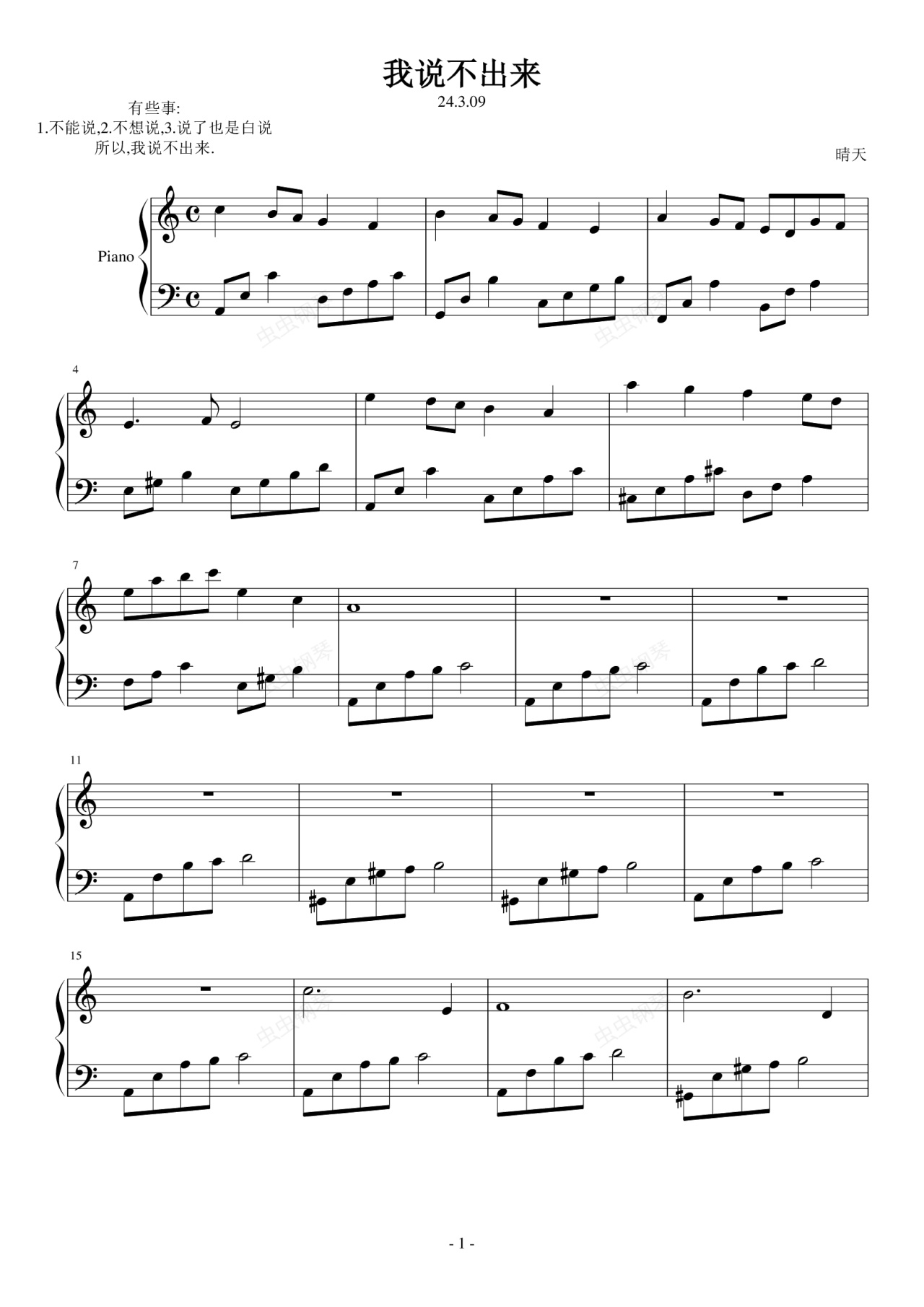 钢琴谱:我说不出来
