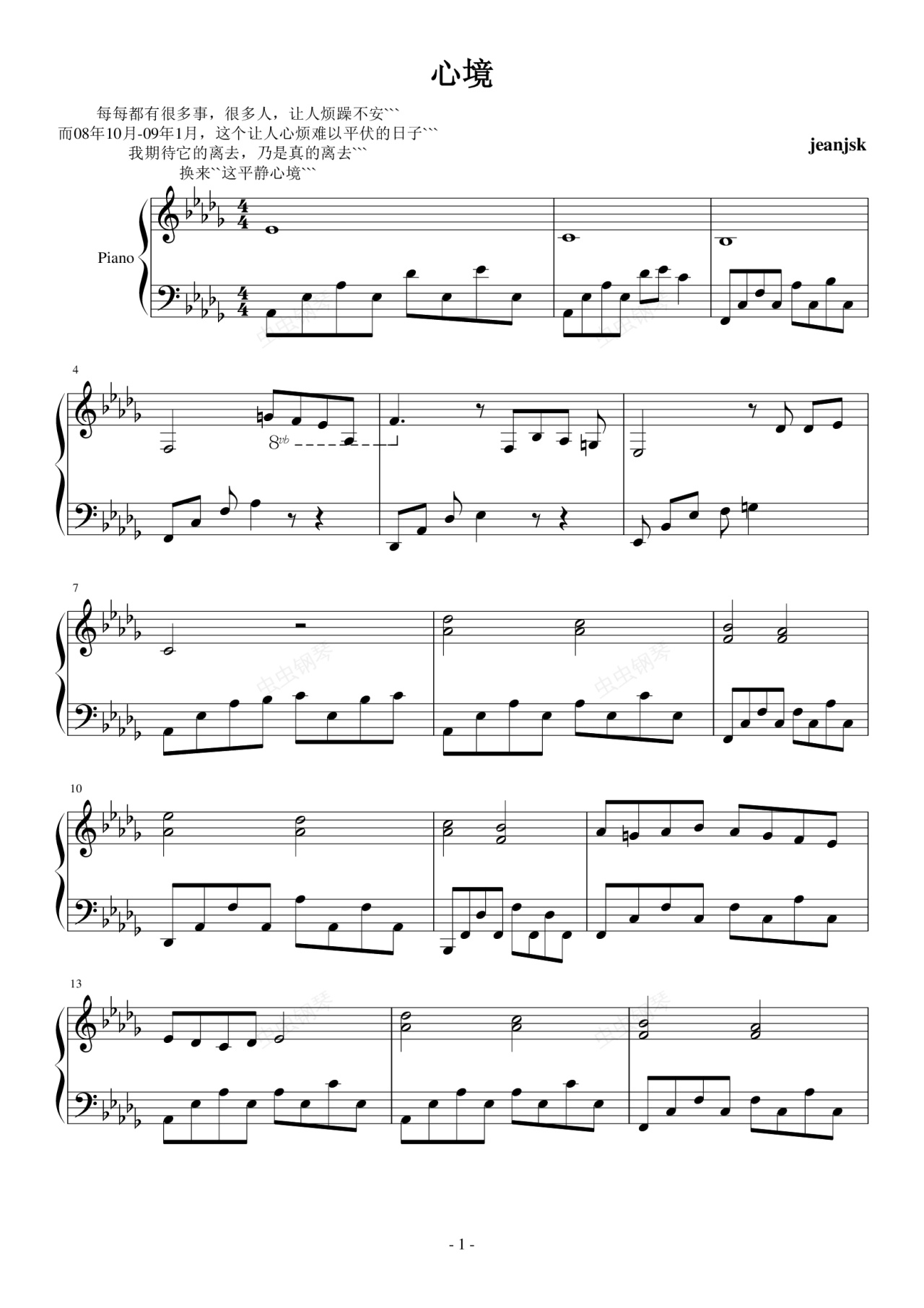 谱子是很久之前写的了···呵呵···不过,没想过要发···因为···很多原因···而今天晚上,把谱子发给蓝幻·影麒麟听了···他说“发吧··为什么不发”呵呵···于是我发了···谢谢你,蓝幻·影麒麟 接下来写写这曲子的心情:进入大学,其实我从来没有想过会这么大的变化,也没有想过要面对这么多事,呵呵···不过,其实人生,每一天都要面对···我记得鲁迅的一句话:人生,最害怕的,是醒来后发现无路可走···所以要直面惨淡人生。呵呵···至少,我现在的人生也不是惨淡的···是吧?,一切发生的都已经过去了···I hope ,我身边的每一位,我的家人,平平安安···快快乐乐地生活。      平静的心境,虽然没有多少起伏,却让人不愿离去···