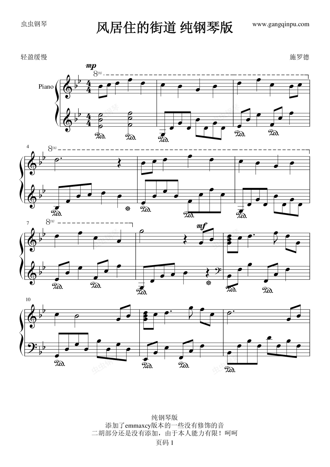 钢琴谱:风居住的街道 纯钢琴版