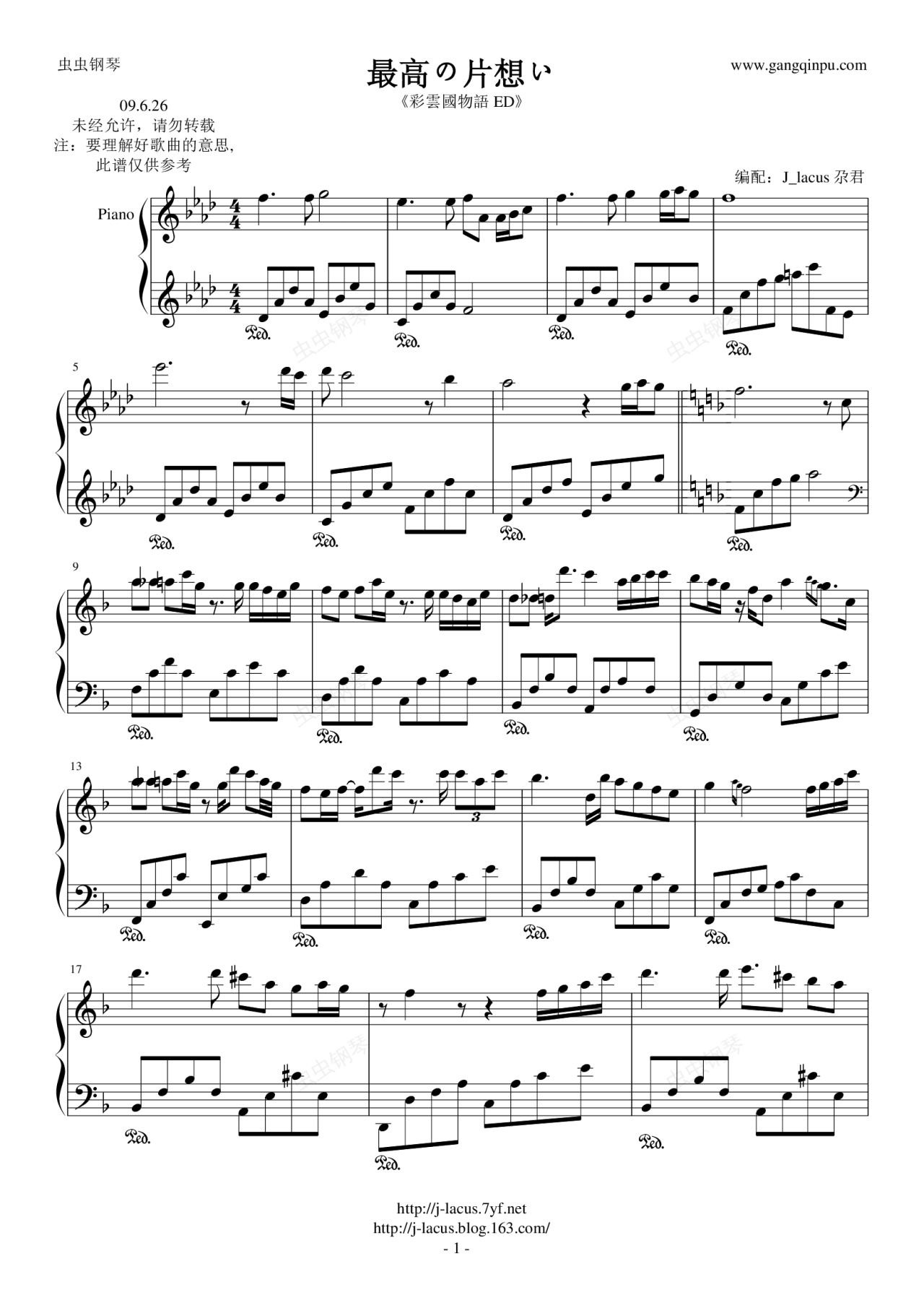 钢琴谱:最高の片想い -彩云国物语--Lacus版