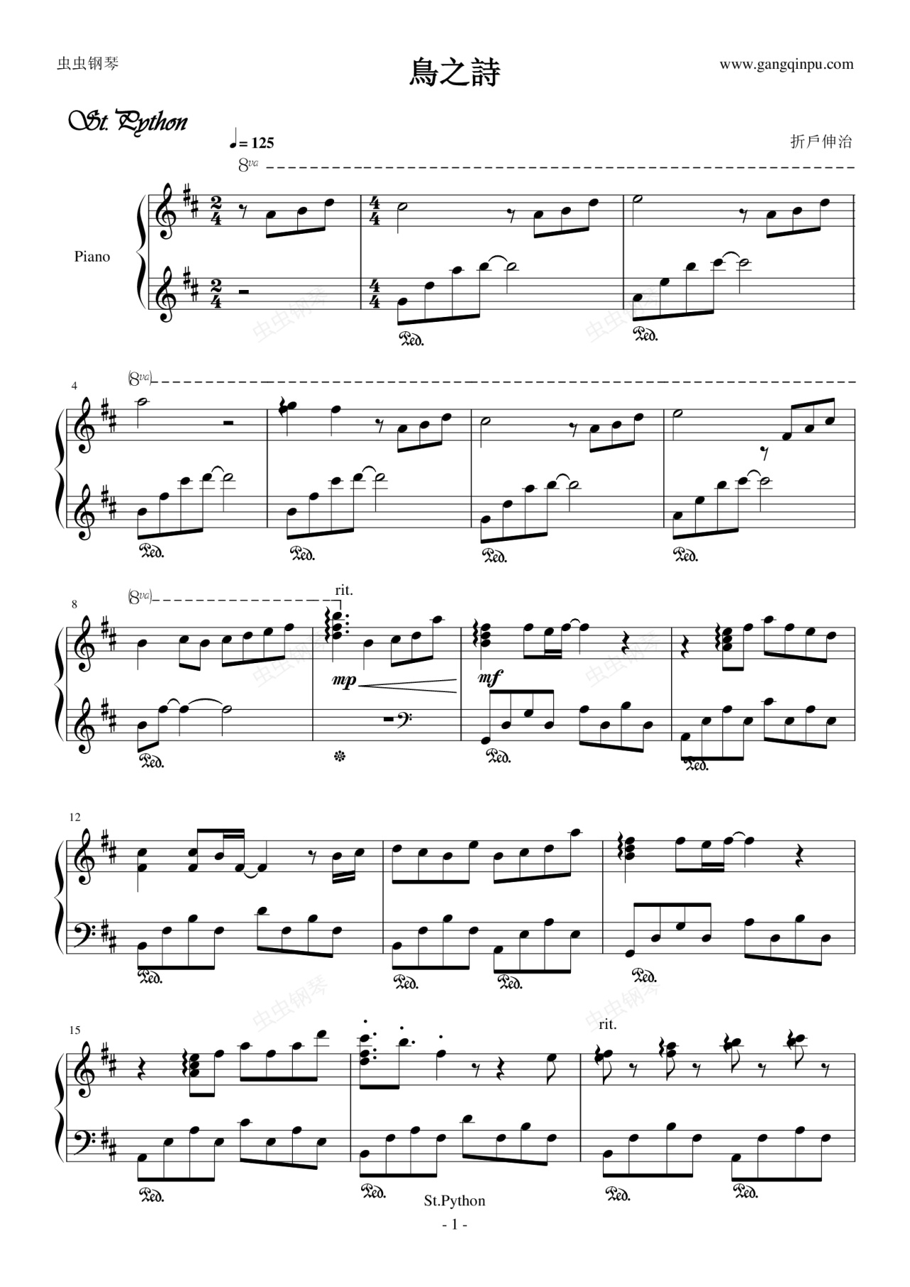 以前一個朋友發給我的,是我聽過最早版本的《鳥之詩》,也是我最喜歡的。雖然不知道這個mid是誰製作的,但很顯然不是十分正規的版本,因為網上找不到它的曲譜,我只好用導出稍加整理,31小節附近我不知道怎麼弄,其實這樣是沒錯的,彈出來也是正確的但一看曲譜,就覺得不自然。有些節奏,我不會表達出來。水平不足,如此而已,希望有人能指正,謝謝。