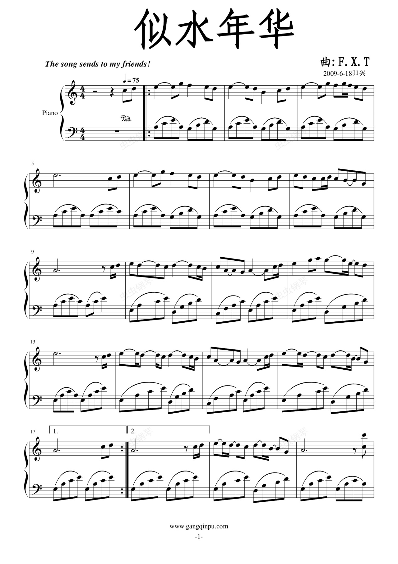 《似水年华》——To my ! 该作品是6月18日由《无止境的见识》伴奏引发即兴曲!独立完成,水平有限,请指教吧!中间我有改动了点,但是还没改上来~再过几天又空吧 经过这半个月的复习与考试,一直闲置,原本名为《淡水遐思》,后来有一天再次弹起时不知不觉得随音符沉醉于回忆之中,情思飘忆,随即回想到以前的我们已经步入高三了,然生活淡如水,却直流奔向大海……不知旋律重复弹了多少遍,还没有清醒过来,似乎老是想起一句诗“江水流春去欲尽,江潭落月复西斜”,于是决定改名为《似水年华》,and to my !the best wish to my ,Come on!every one! 下面是我的朋友听了之后为我写的歌词,有点勉强他了,第一次写歌词~真的很感谢!突然又觉得男女对唱蛮不错的~于是我改了一下歌词! 曲:F.X.T 词:张艺林&F.X.T 男:风中吹过了你的香味­ 我们的童年未曾停止过往 女:回忆起你我走过的时光 恍惚中我又看到了你的身影 男:在那湖边的疯­ 女:在那树下的傻­ 男女:我们的时光沉淀­下来 在那白云底下­ 在那皓月当空­ 我们的誓言未曾停歇 ……(前奏)­ 男:风中吹过了你的香味­ 我们的童年未曾停止过往 女:回忆起你我走过的时光 恍惚中我又看到了你的身影 男:在那湖边的疯­ 女:在那树下的傻­ 男女:我们的时光沉淀­下来 今日高歌一曲 祭奠童年的梦 可曾记得你我的时光 女轻声唱:可曾记得你我的时光 高潮:(到这里没有加过渡,如果不好的请见谅) 男:你强颜欢笑 是否曾渴望 男女:过去不在成为过去 女:生命本如此 却为何强求 男女:只求今日的回忆清晰 男:风中吹过了你的香味­ 我们的童年未曾停止过往 女:回忆起你我走过的时光 恍惚中我又看到了你的身影 男:在那湖边的疯­ 女:在那树下的傻­ 我们的时光沉淀­下来 男女:今日高歌一曲 祭奠童年的梦 可曾记得你我的时光 (可曾记得你我的时光) (其他乐器的加入可能会使伴奏更完美一些,本人只通过想象描绘伴奏,因为其他乐器暂时还不会用,不敢随意画蛇添足,请见谅,若有幸有人可以帮忙,那就太谢谢了)