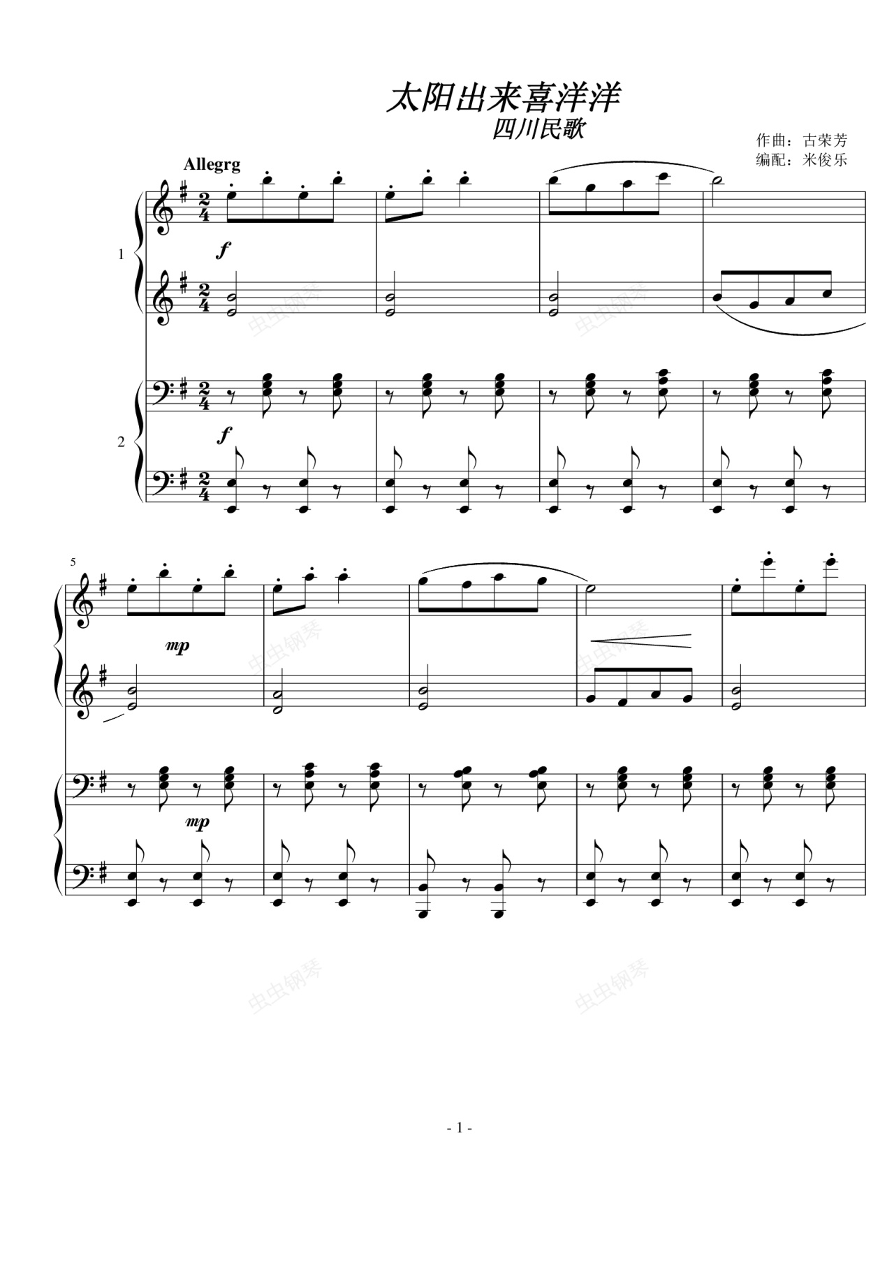 钢琴谱:太阳出来喜洋洋(四手)