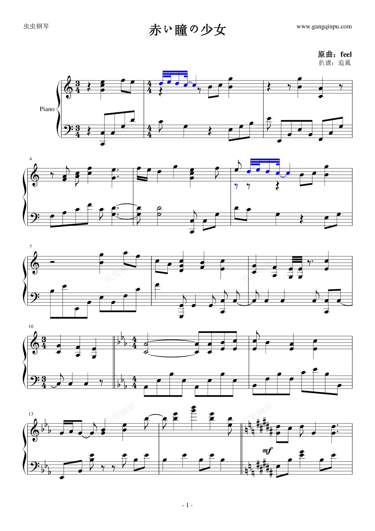 钢琴谱:天使恋曲BGM《赤い瞳の少女》