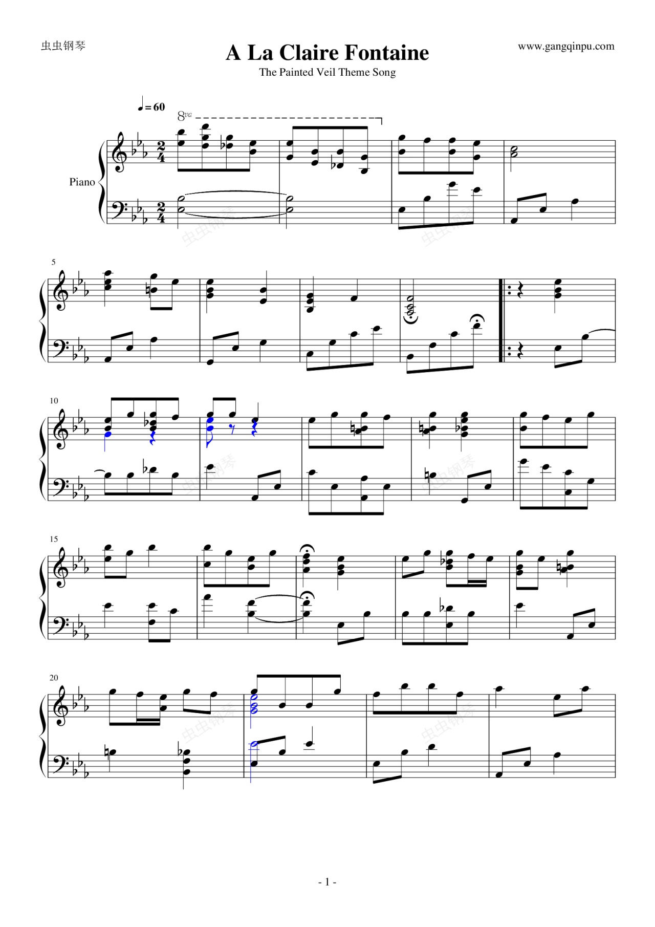 钢琴谱:面纱原声-A La Claire Fontaiine