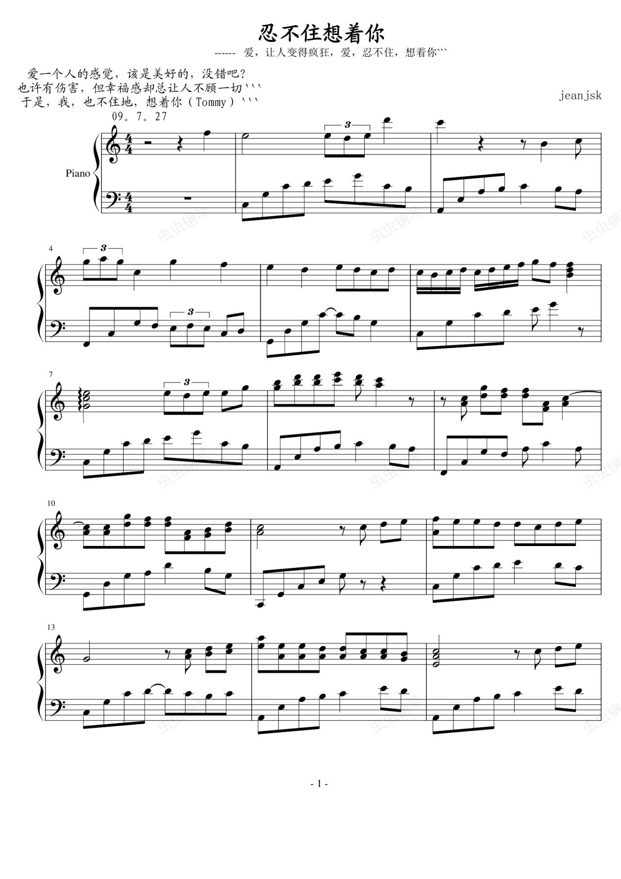 钢琴谱:忍不住想着你