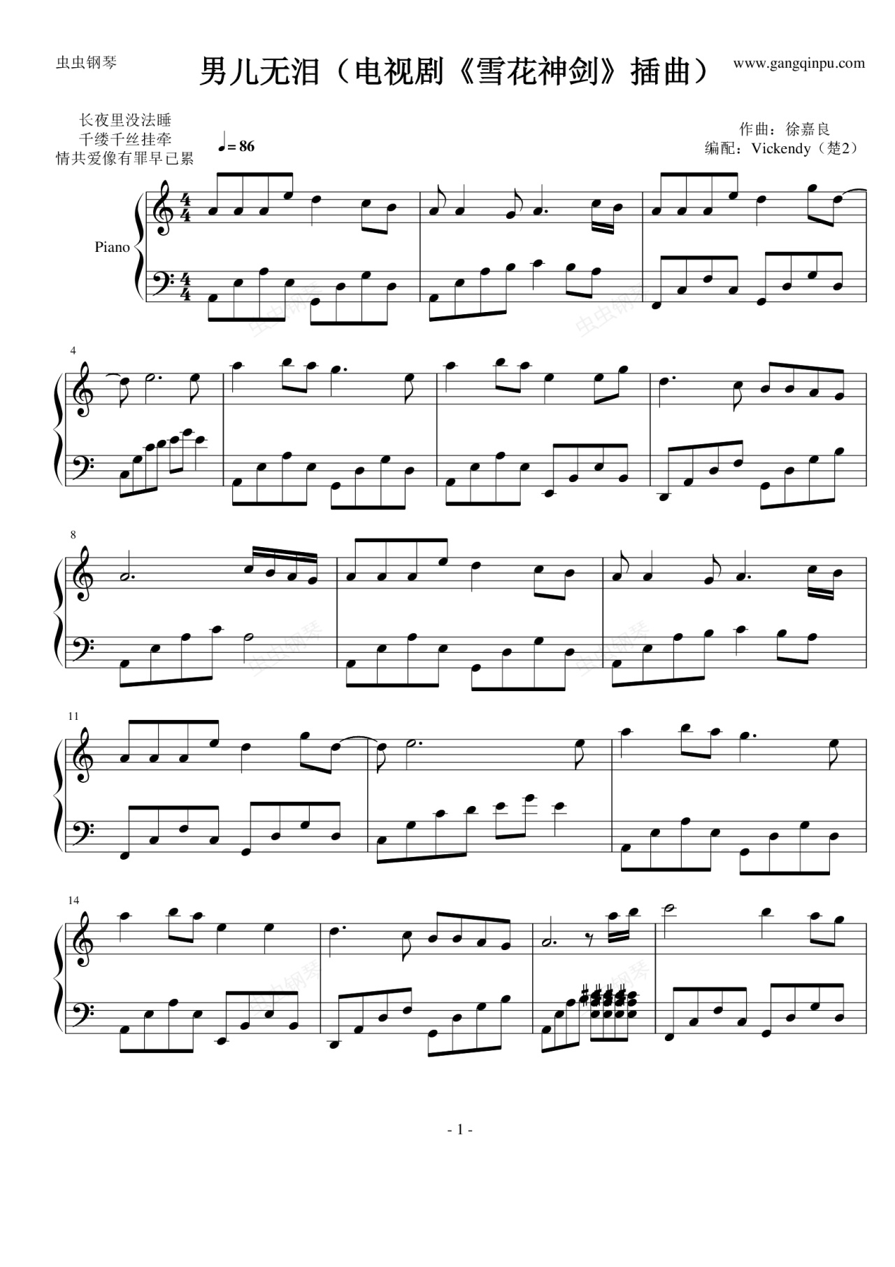 钢琴谱:男儿无泪(电视剧《雪花神剑》片尾曲)