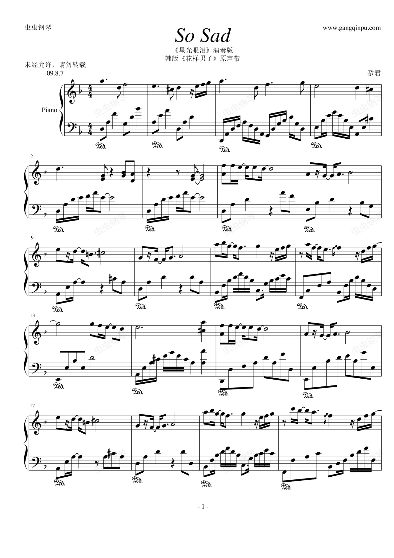 钢琴谱:So Sad 星光眼泪演奏版——韩版《花样男子》