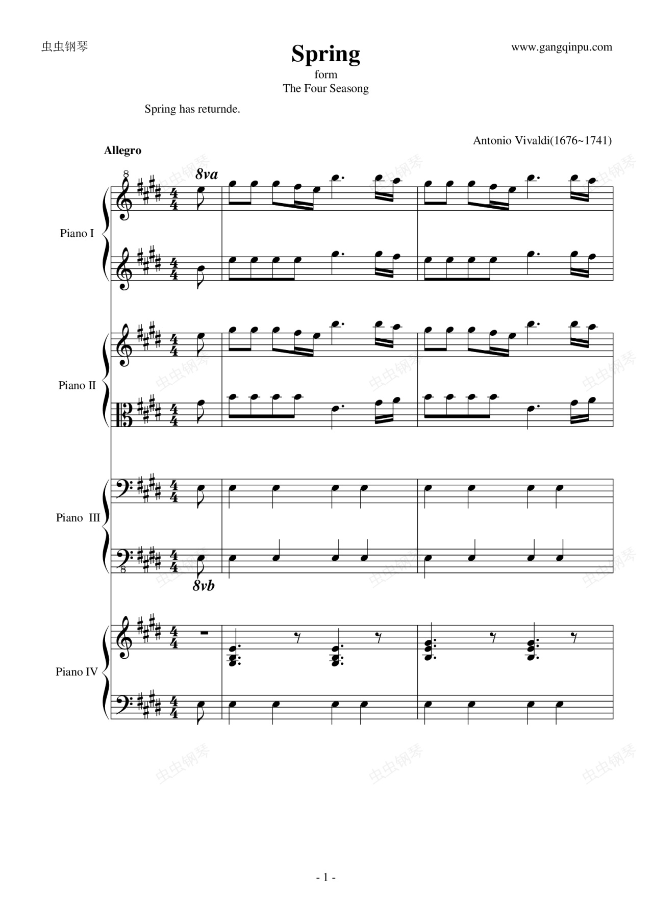 钢琴谱:四季·春 钢琴四重奏