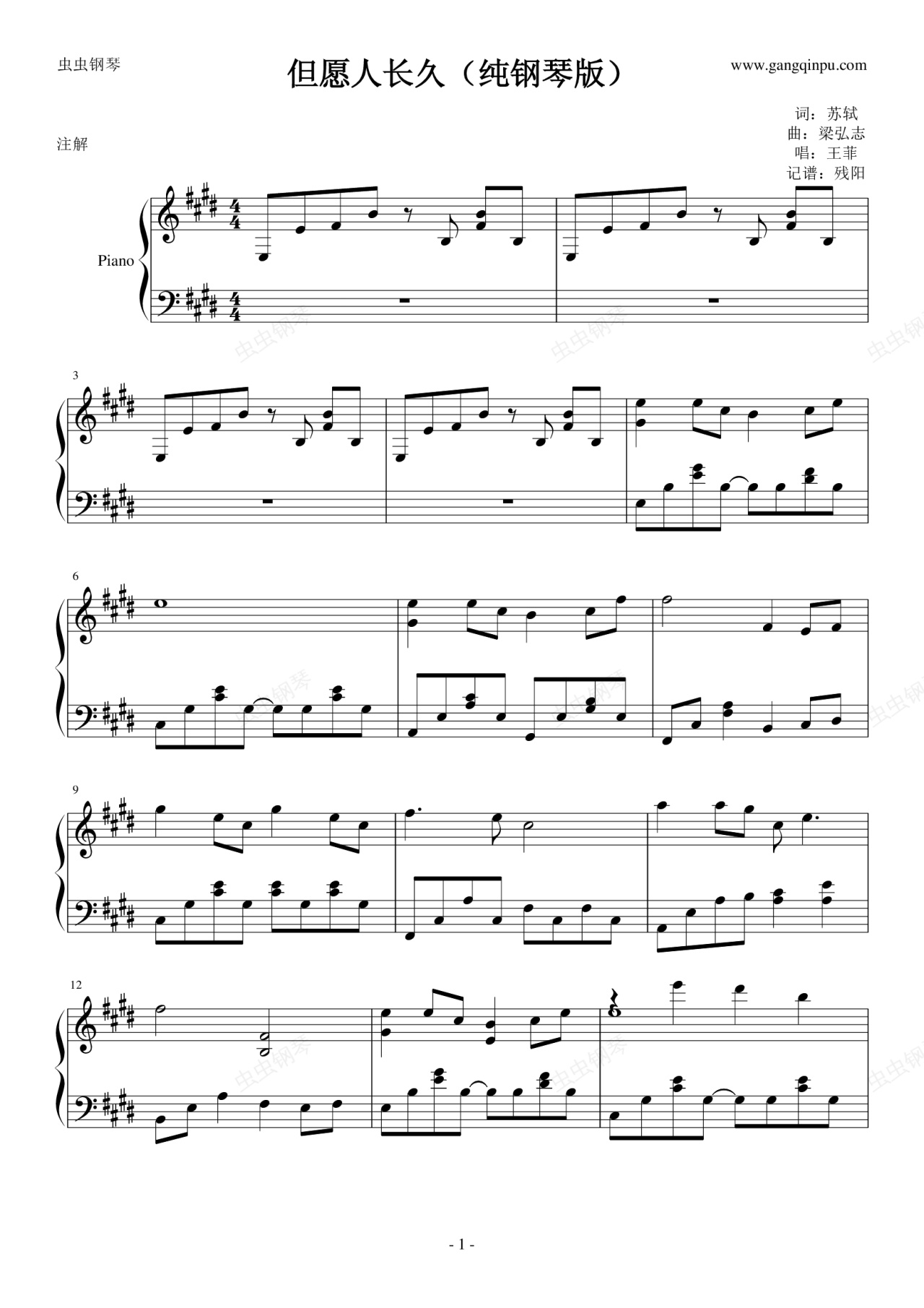 钢琴谱:但愿人长久(纯钢简易版)