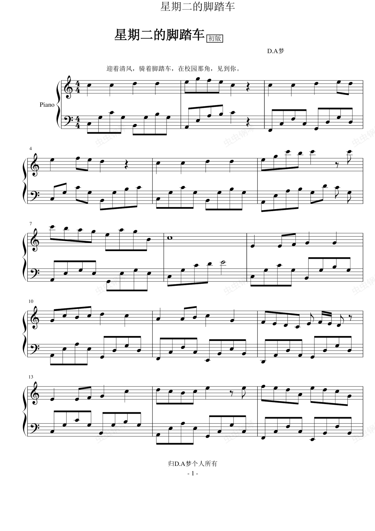 钢琴谱:星期二的脚踏车