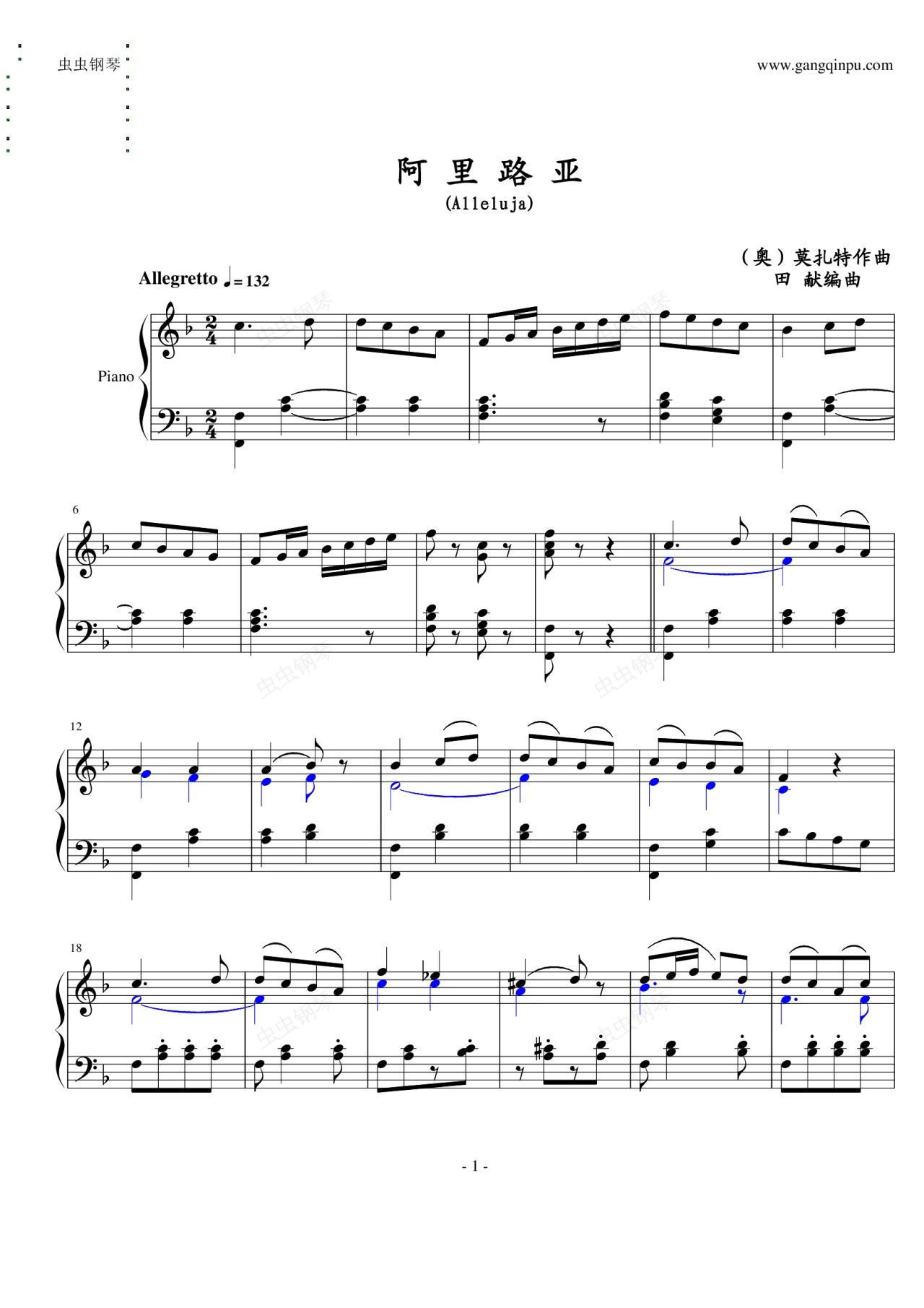 钢琴谱:阿里路亚(田献编曲)