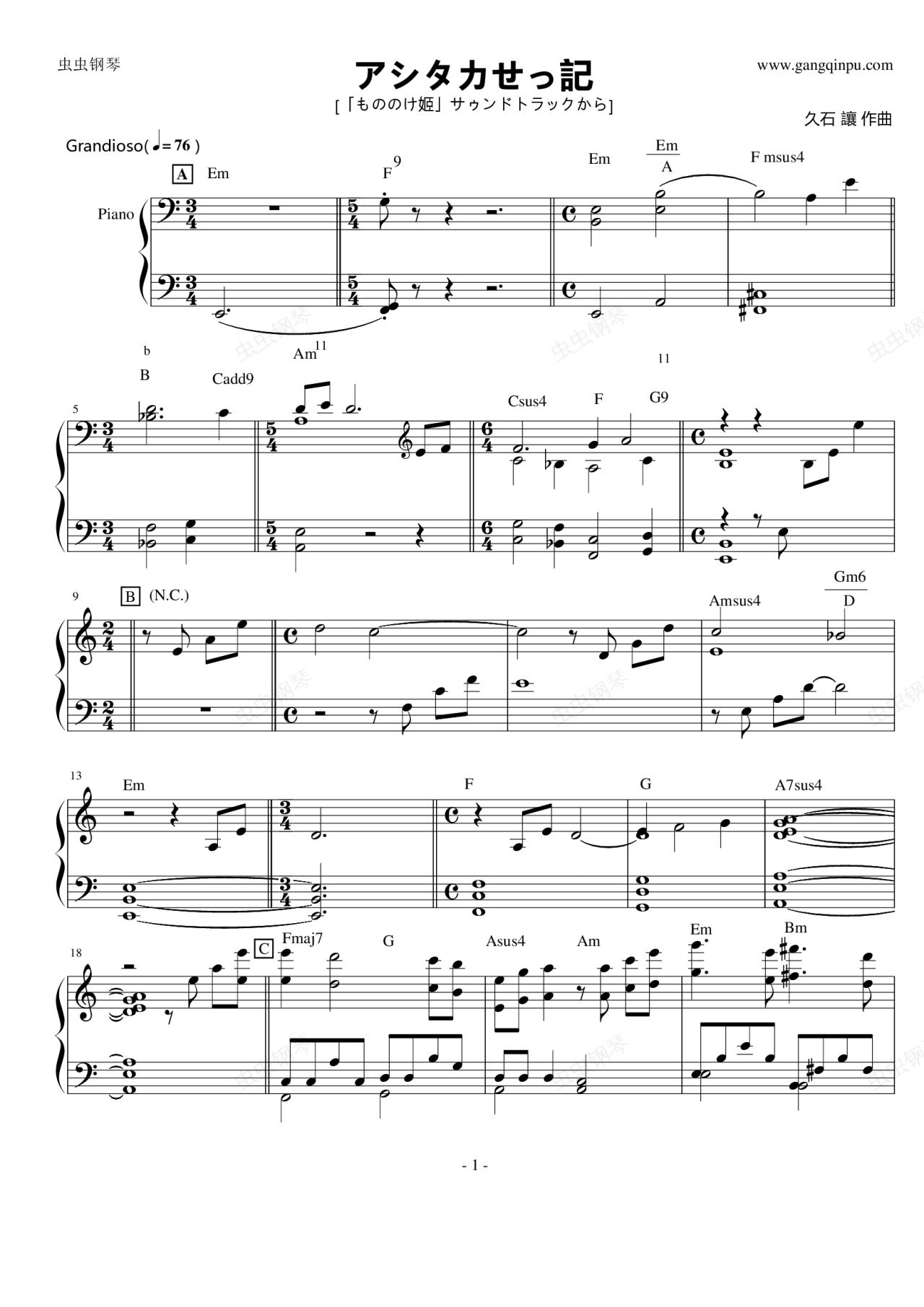 钢琴谱:《幽灵公主》原版配乐-1.アシタカせっ記