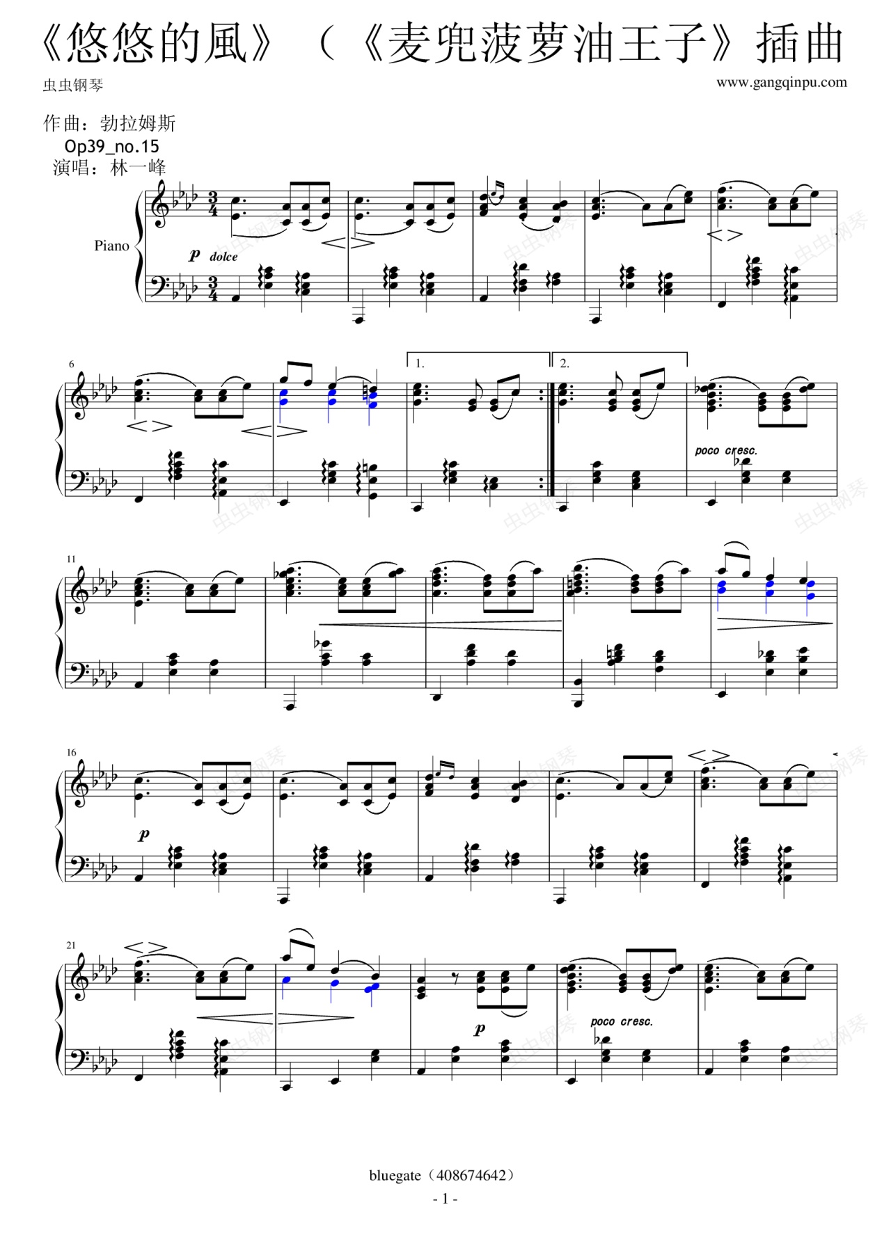 钢琴谱:《悠悠的风》(《麦兜菠萝油王子》插曲