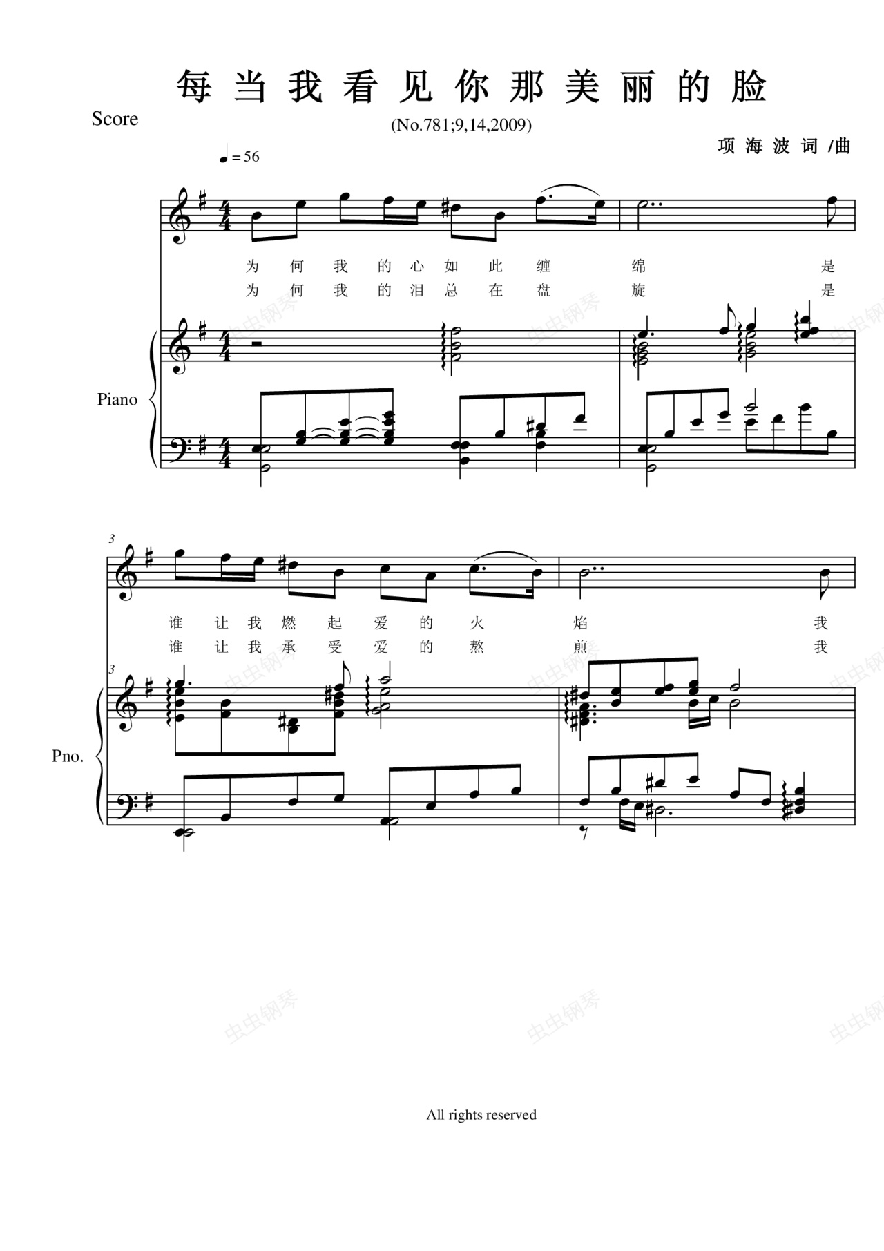 钢琴谱:每当我看到你那美丽的脸