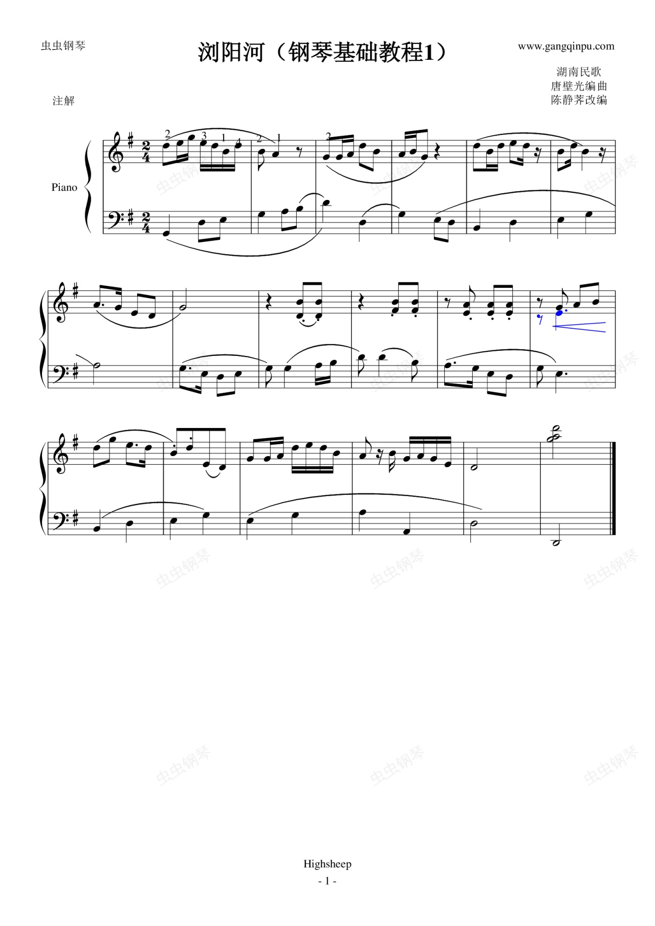 钢琴谱:浏阳河(钢琴基础教程1)