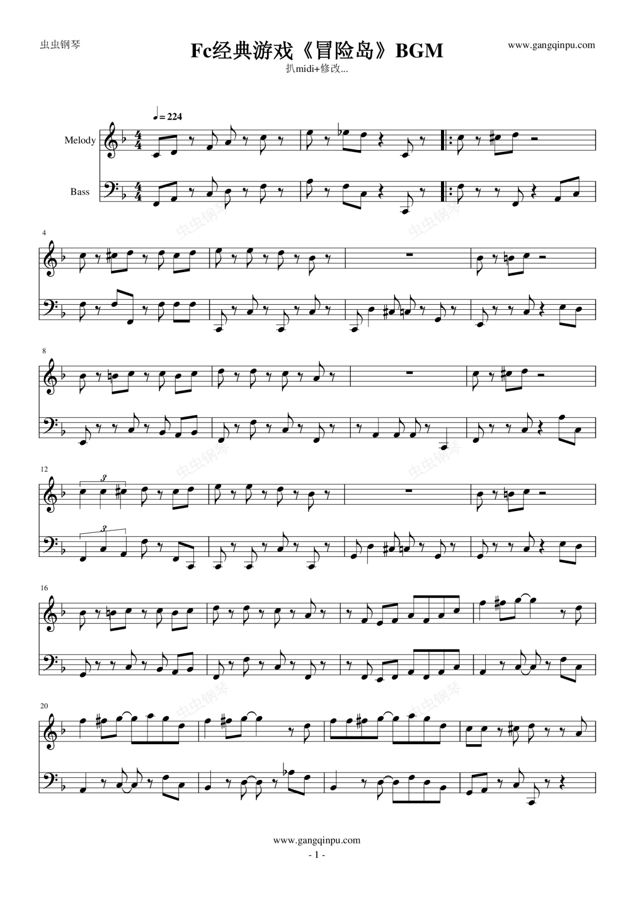钢琴谱:FC游戏《冒险岛》