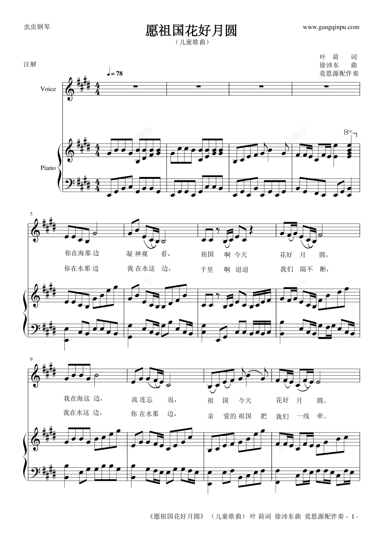 钢琴谱:愿祖国花好月圆(儿童歌曲)小荷 词 徐沛东曲 竟恩源配伴奏