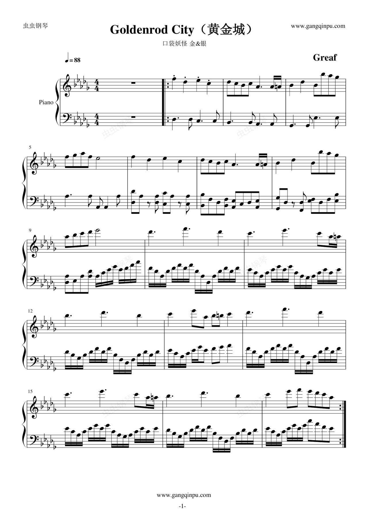 钢琴谱:口袋妖怪 - Goldenrod City(黄金城)
