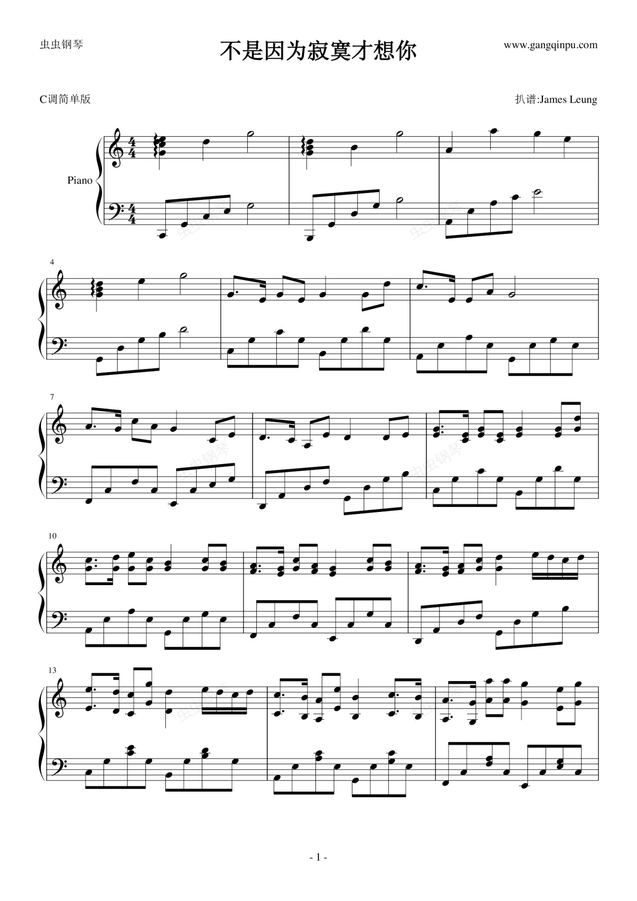 钢琴谱:不是因为寂寞才想你