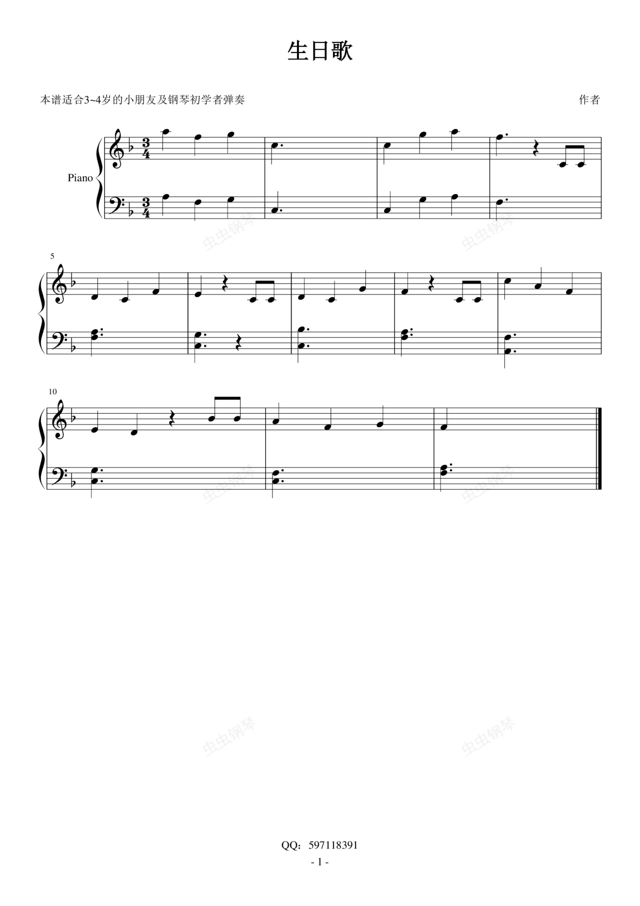 本谱适合3~4岁的小朋友及钢琴初学者弹奏