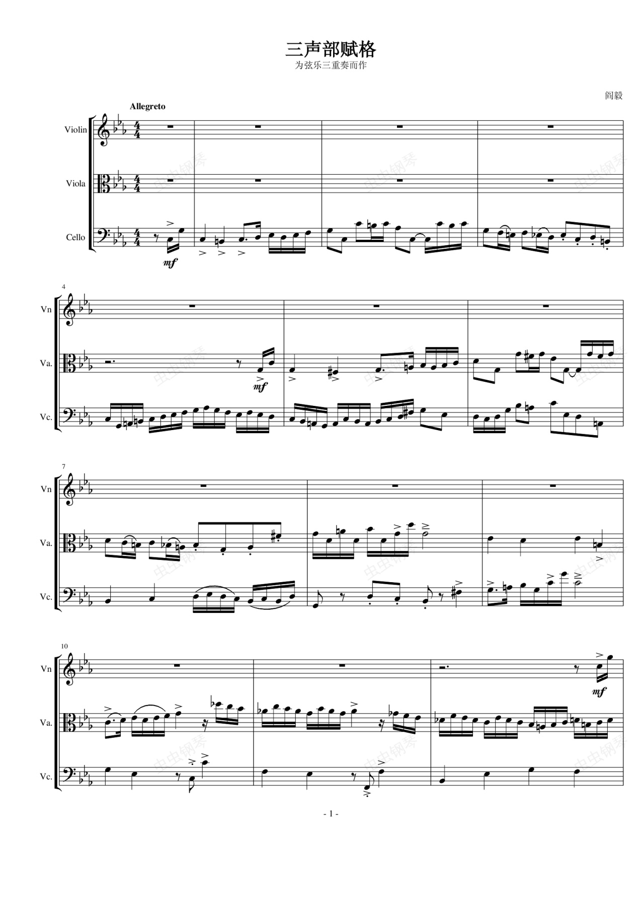 钢琴谱:三声部赋格(为弦乐三重奏而作)
