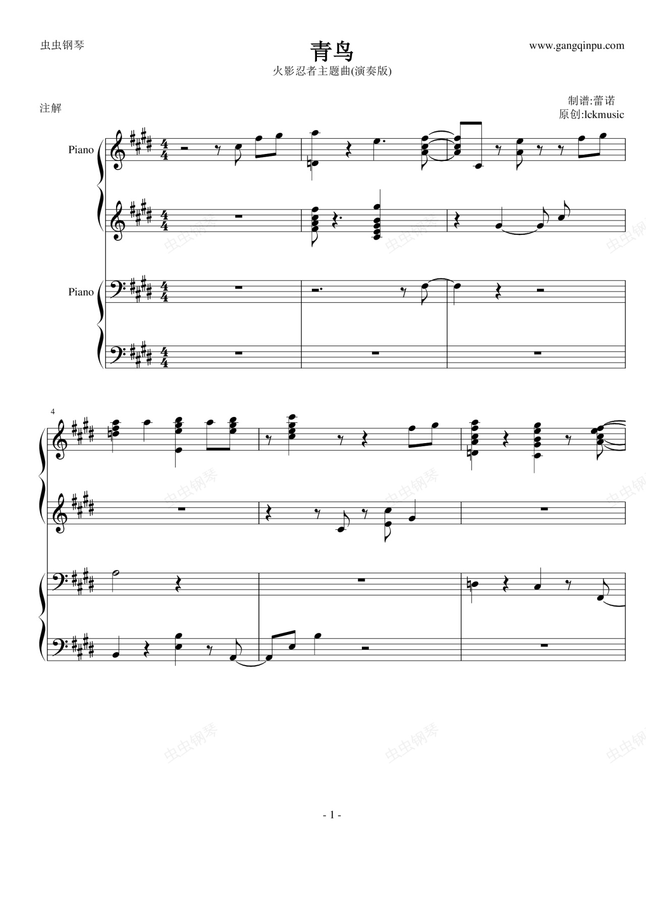钢琴谱:青鸟-火影主题曲(演奏版)