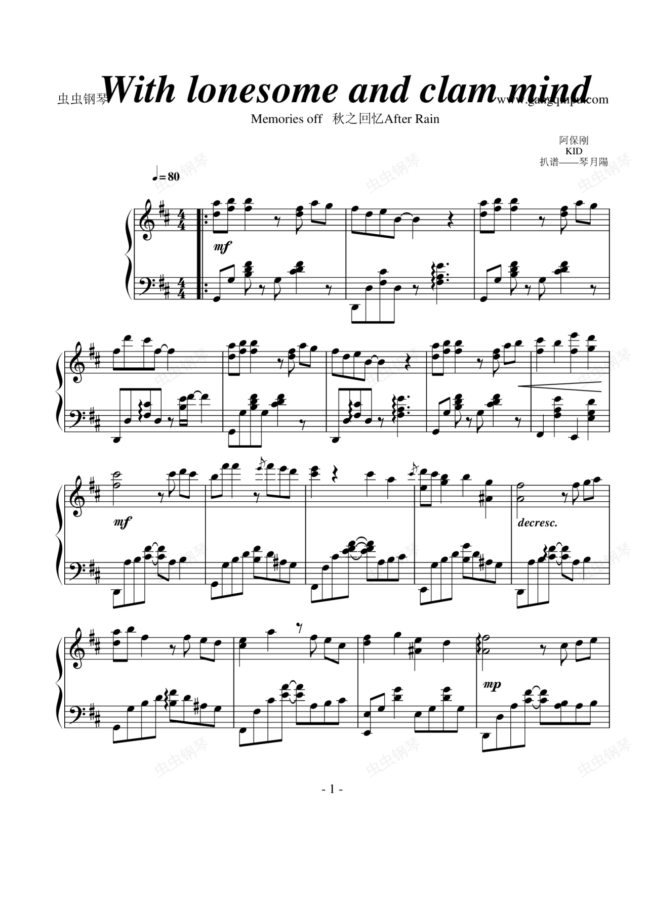 钢琴谱:With lonesome and clam mind 秋之回忆雨后