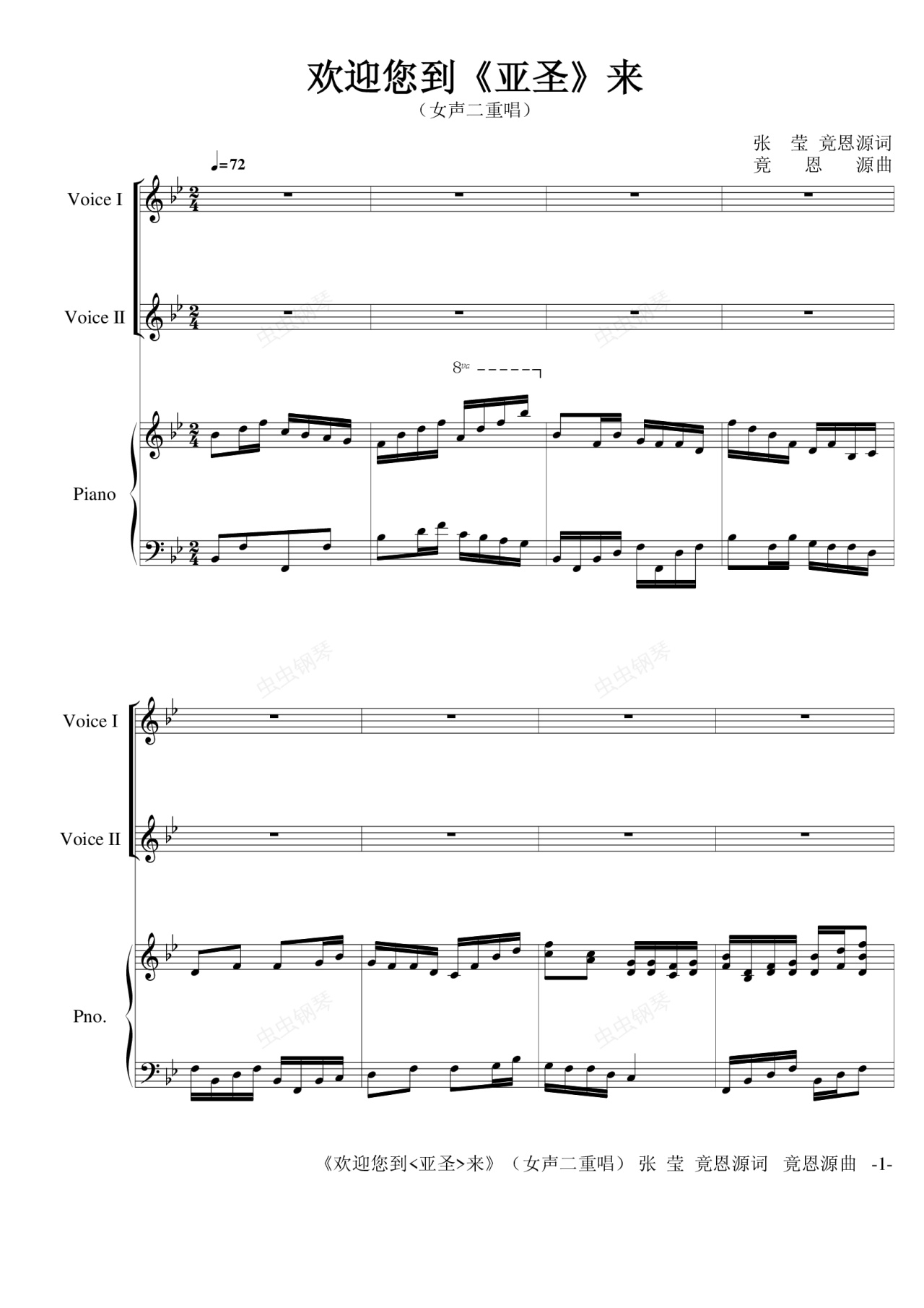 钢琴谱:欢迎您到《亚圣》来 (女声二重唱)张 莹 竟恩源词 竟恩源曲